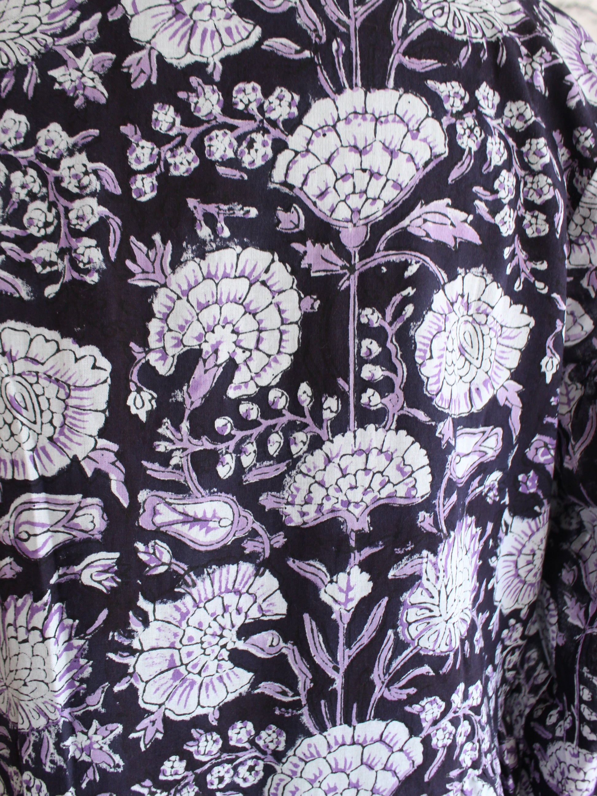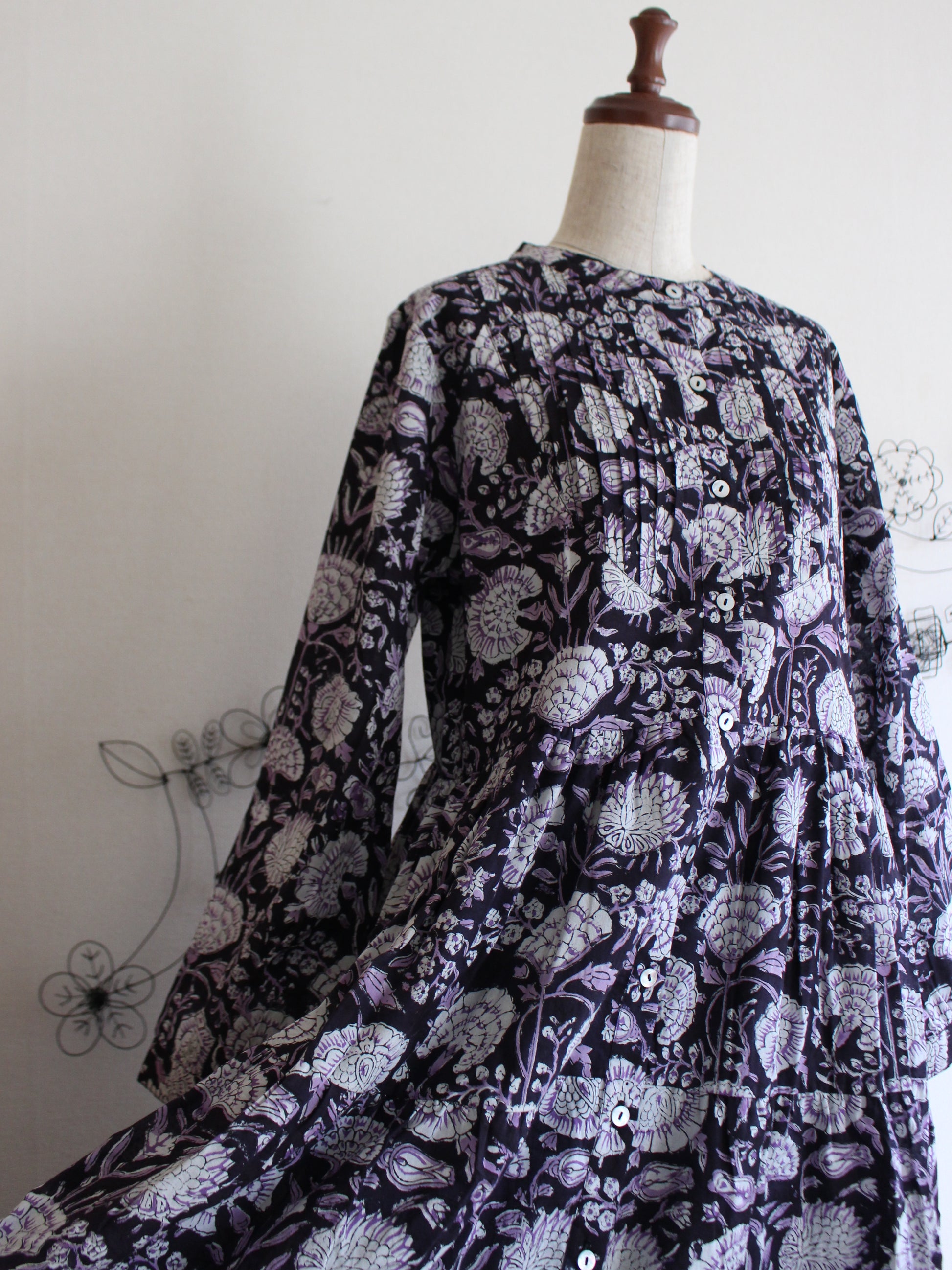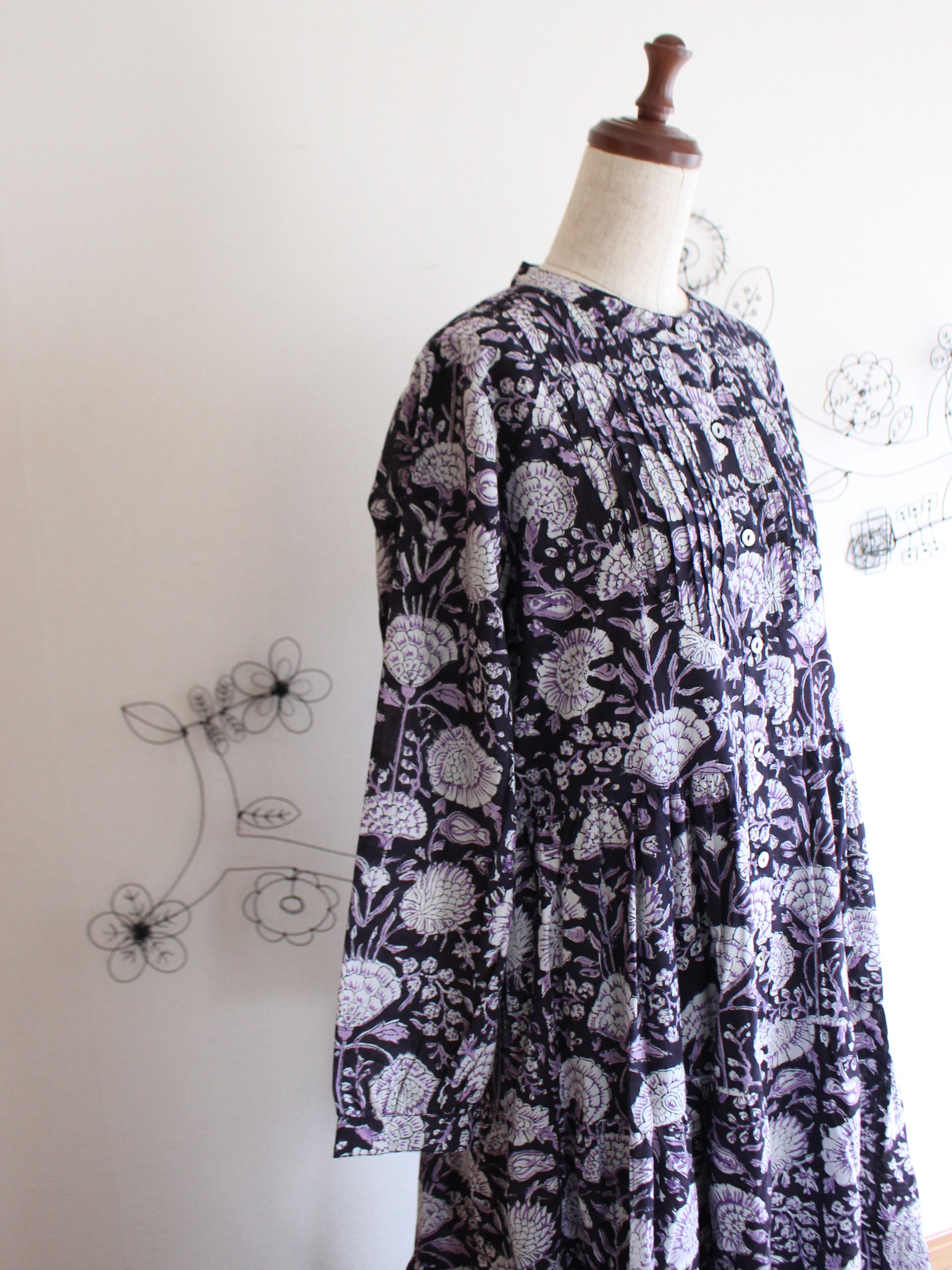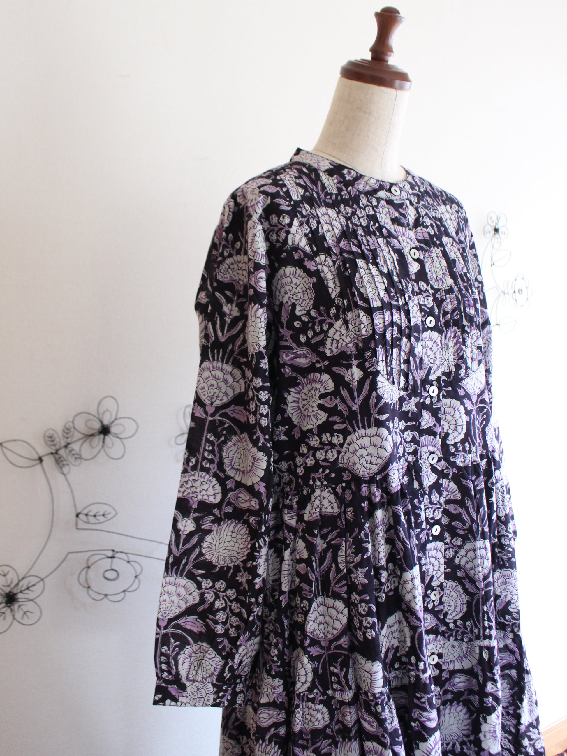 これぞブロックプリント!っといった感じの王道ゴージャス!お好きな方が多いのではなかろうか?そして、絶対に似合う方が多いのではないだろうかっというゴージャスな柄。お色味も着やすい黒なのに、華やかな柄でもあるので、ちょっと色物はっという方にもおススメしたいワンピースになります。派手!っという感じでは全くなくて、むしろ落ち着いた品もしっかりある美しいドレスになります♪秋冬の定番服になりそう♪