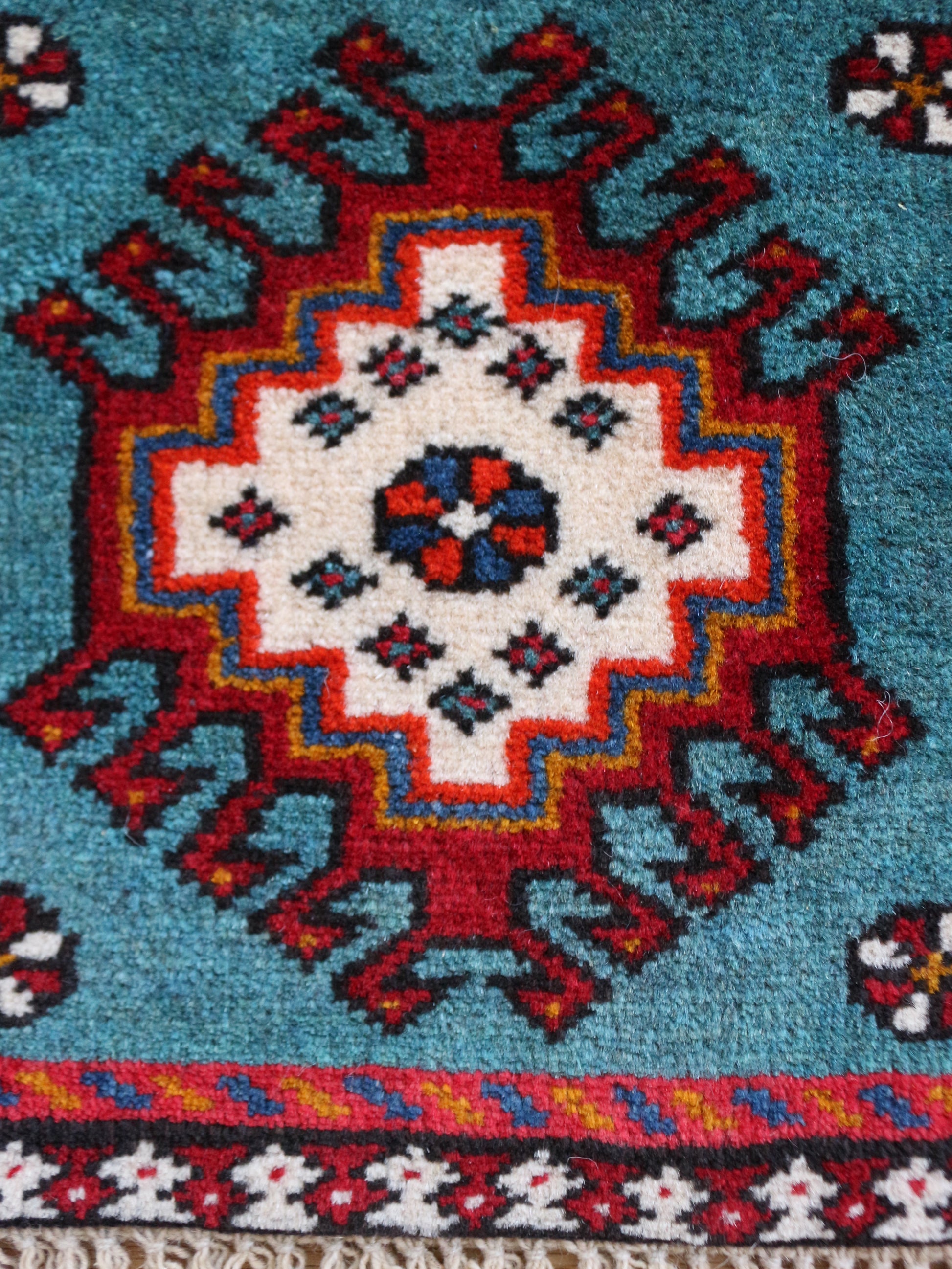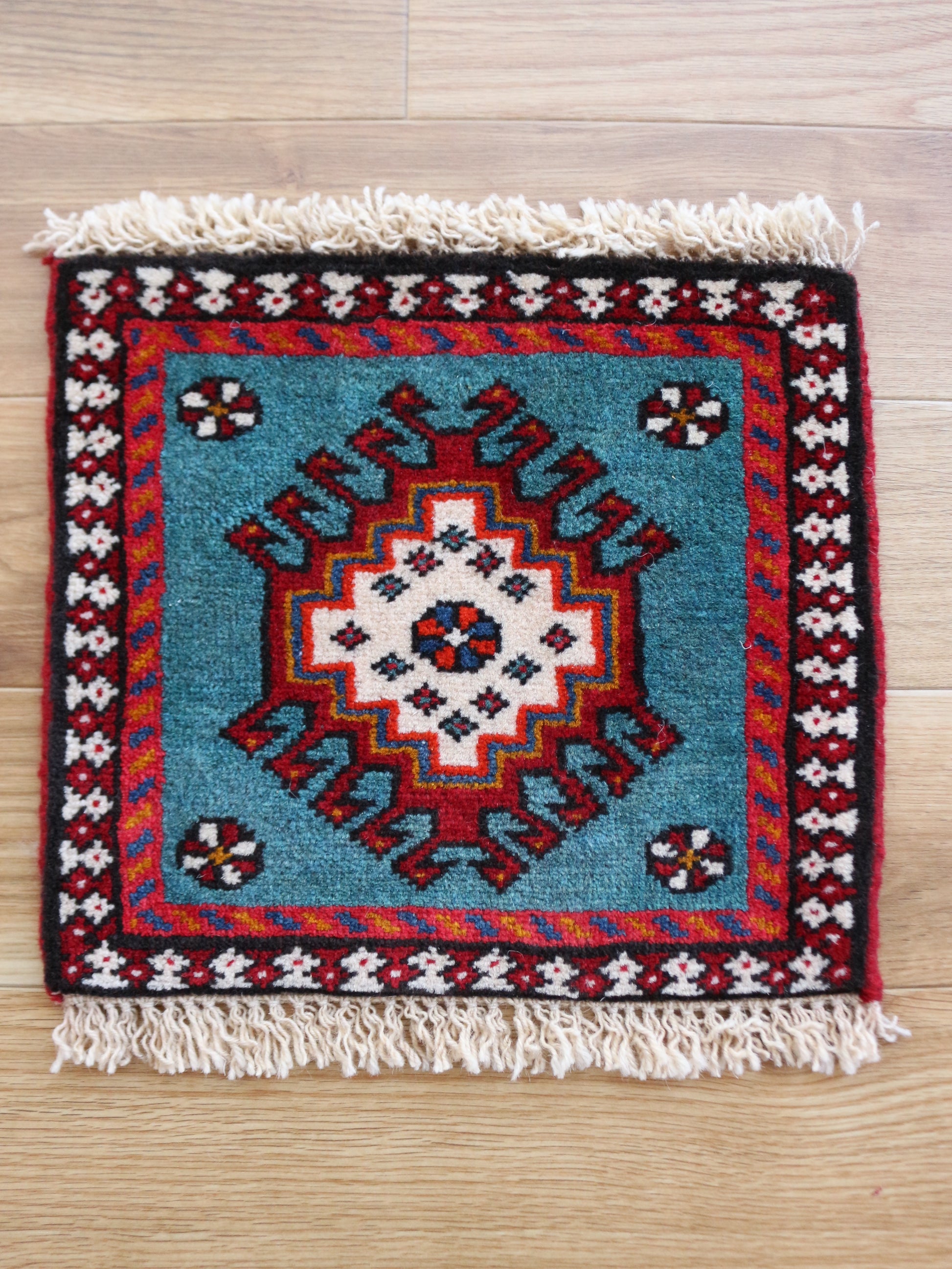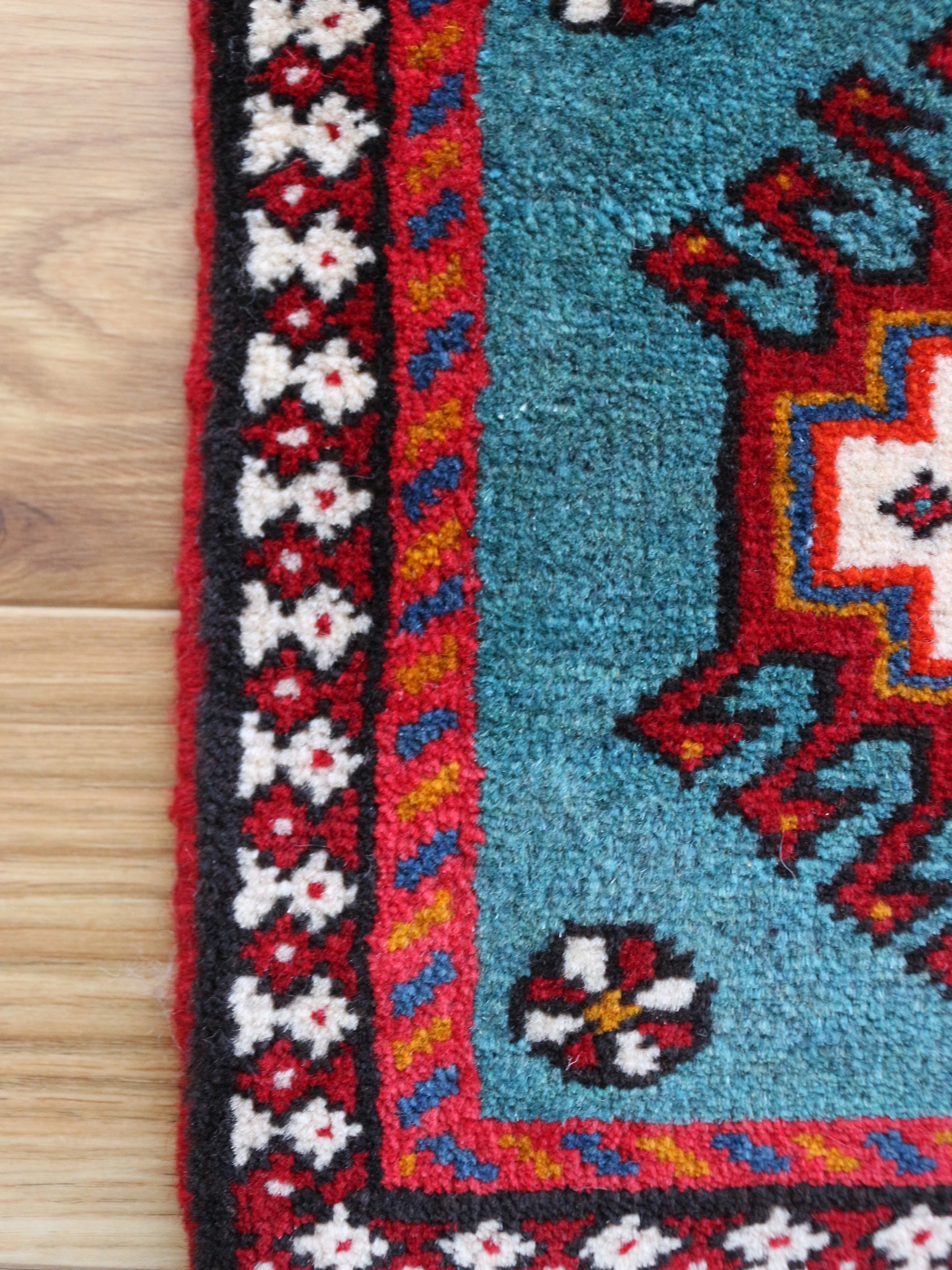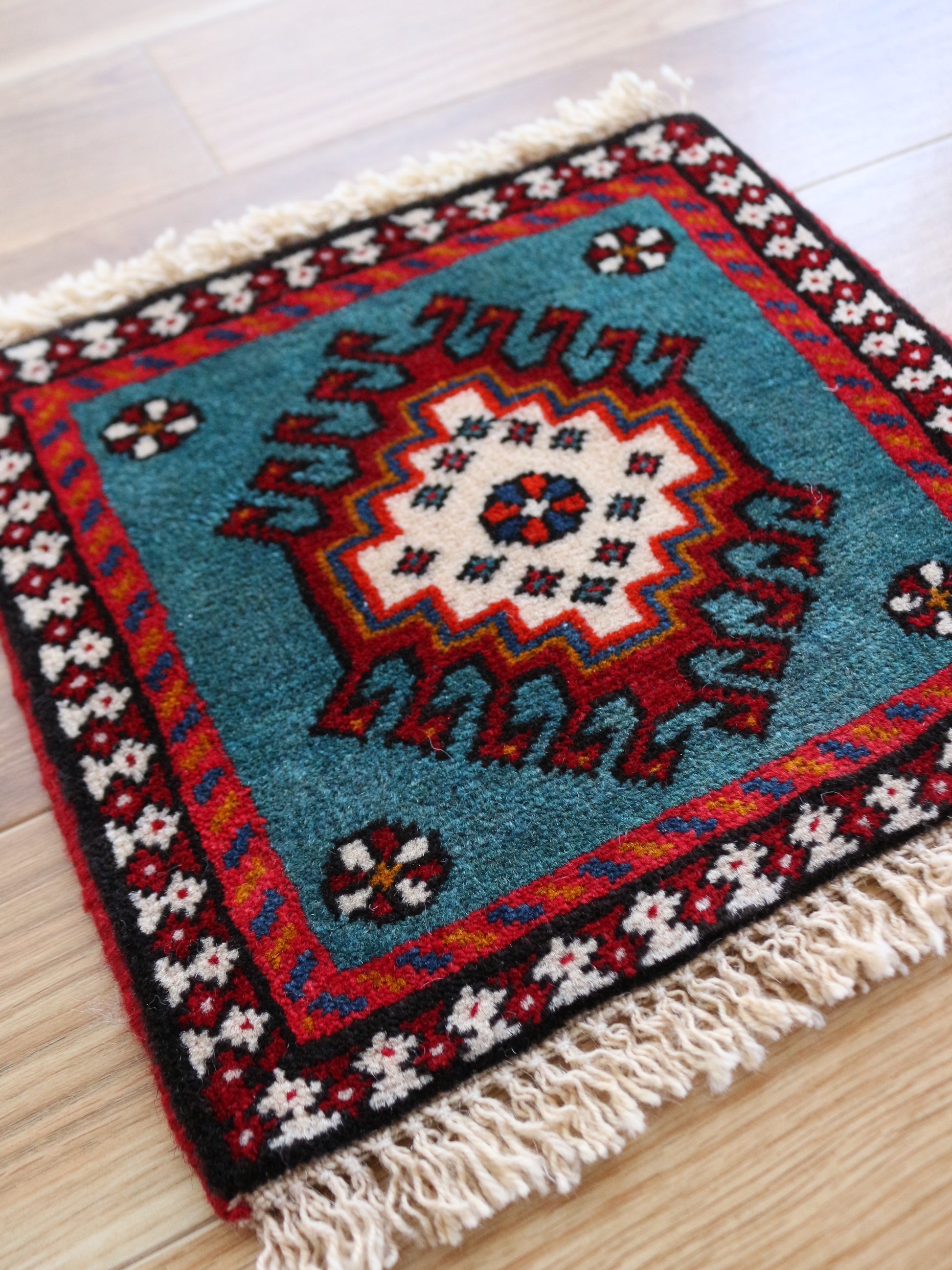 色でしょ!!絶対にこの色味!!!緑とも青とも言えない絶妙なお色味!あと赤の配色がまとまりがあってとっても美しいです。シンプルなんだけど、上手にまとまったラグかなぁっと思います。何にせよ、この緑とも青とも言えないのが好きすぎる。。。