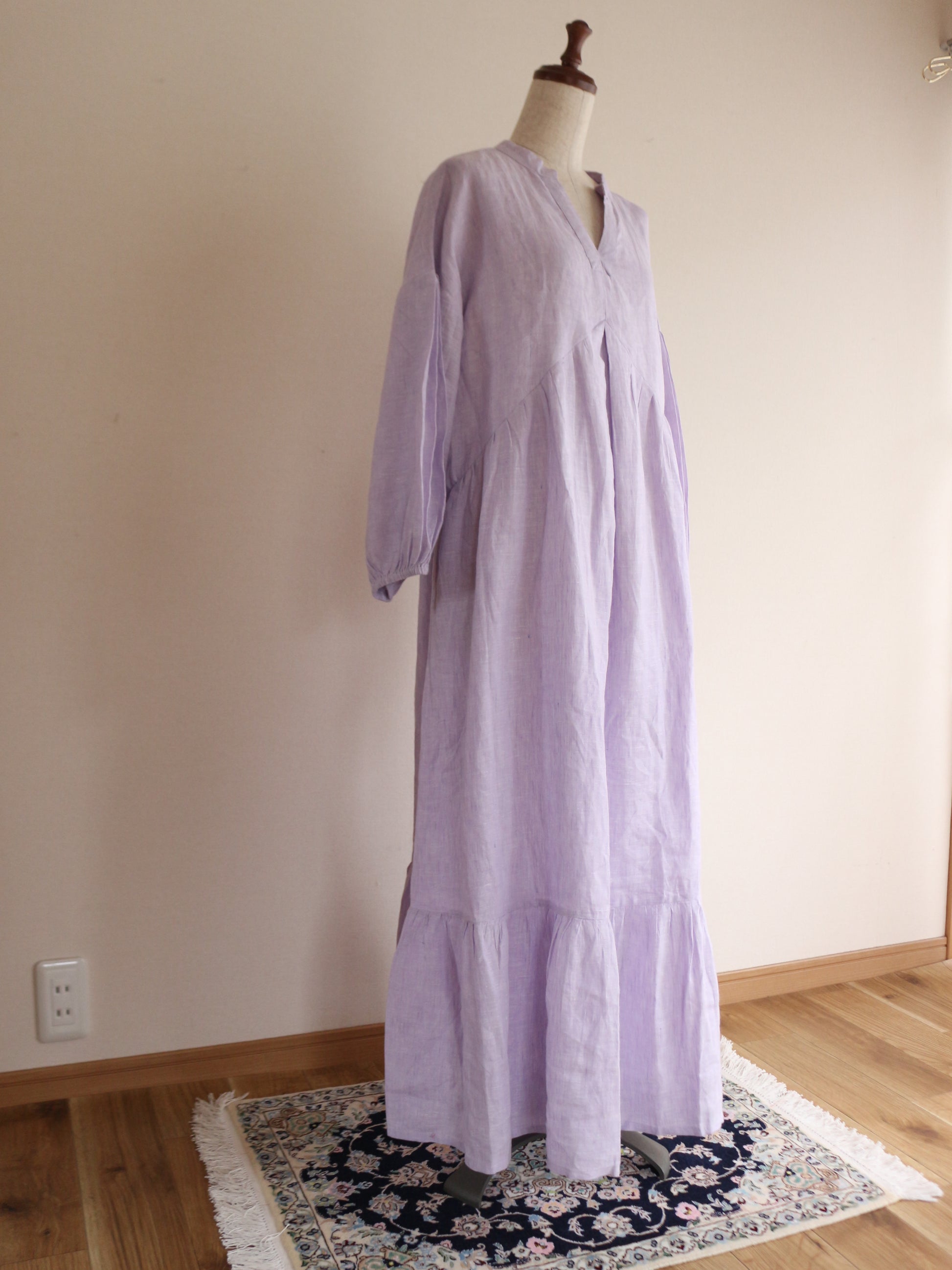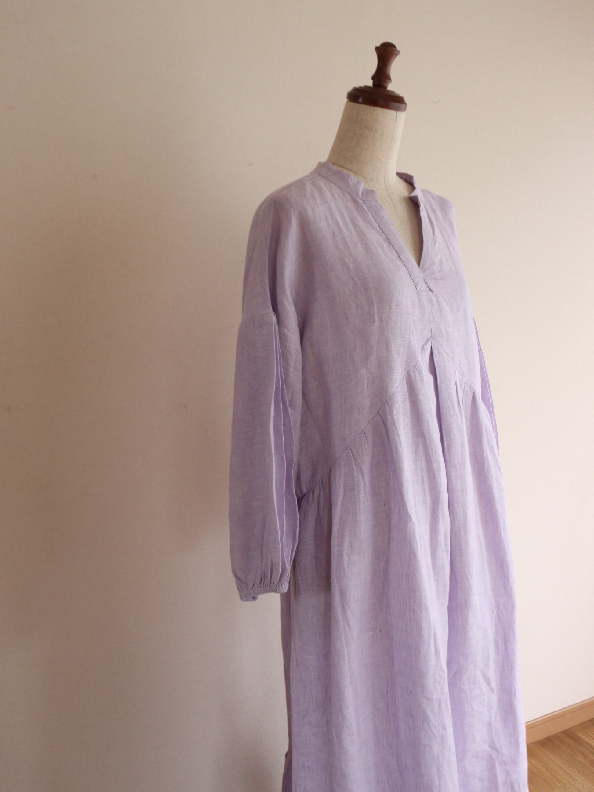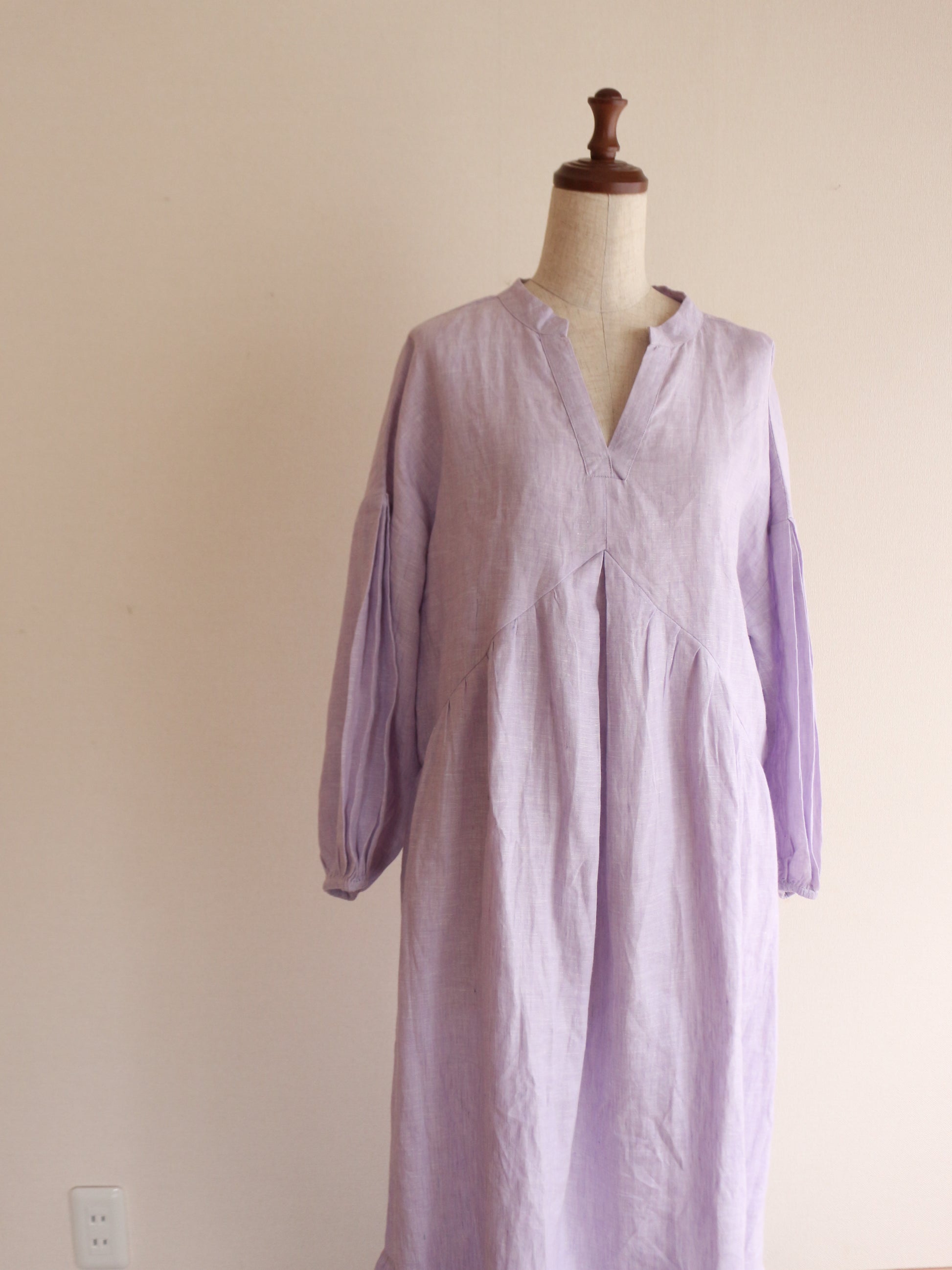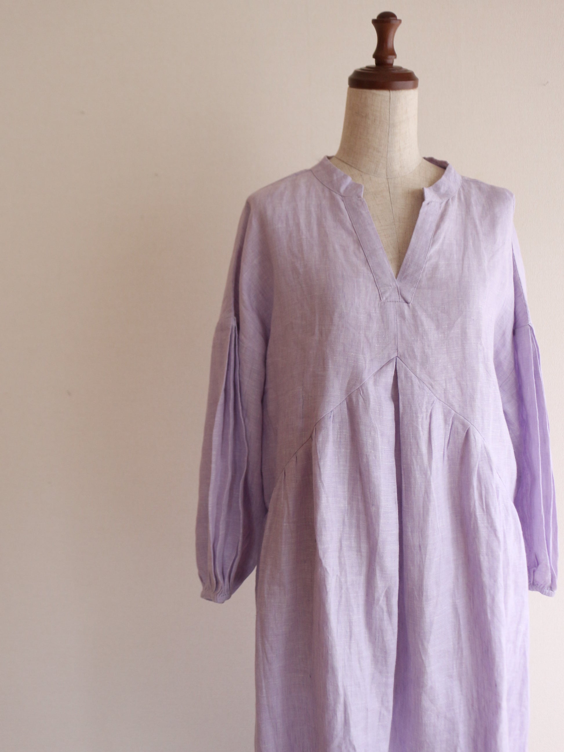 今回、こちらのワンピースを作るのに一番考えたコンセプトは「ゆるっと着れるのに、形が美しいもの」前身の山形の切り返しの部分にこだわりを持ってきたのですが、上過ぎても下過ぎても何だかシルエットがなんだか上手くはまらない。ちょうどよい高さに修正し足長効果を演出。前にギャザーを入れても何だかぼわっとするので真ん中に大きなタックと両脇にも大きなタックを入れてぼわつきを抑え。後ろの首元にギャザーを入れたかったのですが、やはり何だか後ろの生地がやっぱりぼわつくだぼつく、、、。そこで後ろの腰の位置にゴムを入れ後ろのダボつきを取り、体のラインを少し拾うようにして、後ろのシルエットを可愛くしました♪袖の部分にもタックを入れましたが、ただ可愛すぎるのも嫌なので控えめにしてあまり入れすぎないように。シンプルし過ぎないで、でも可愛すぎないで。大人が着れる華やかで、シルエットが美しいワンピースを一生懸命考えました。色が変わればまただいぶ雰囲気が変わるかと思います。今回は春の色味で大人の色味のミスティラベンダーを採用してみました♪