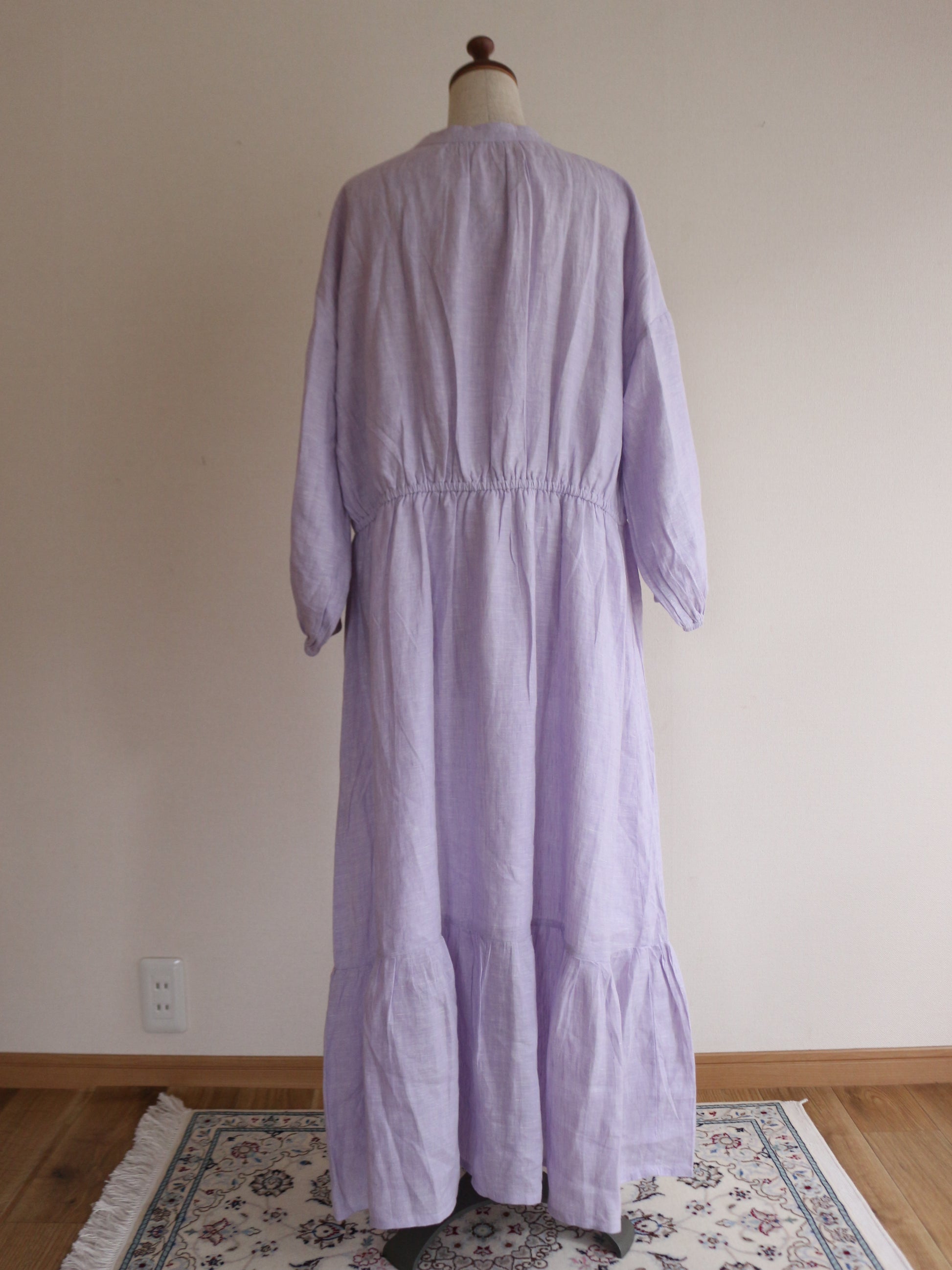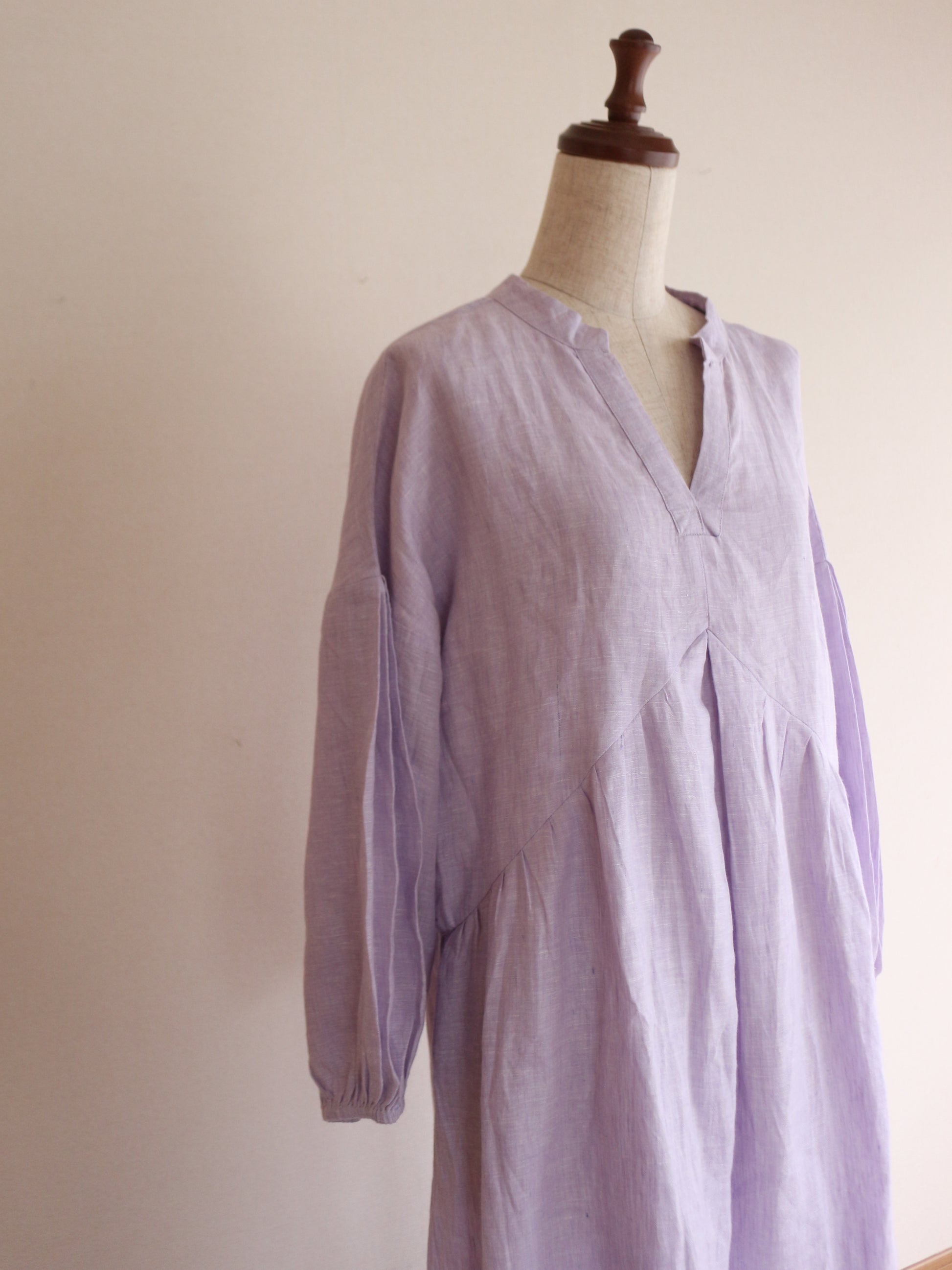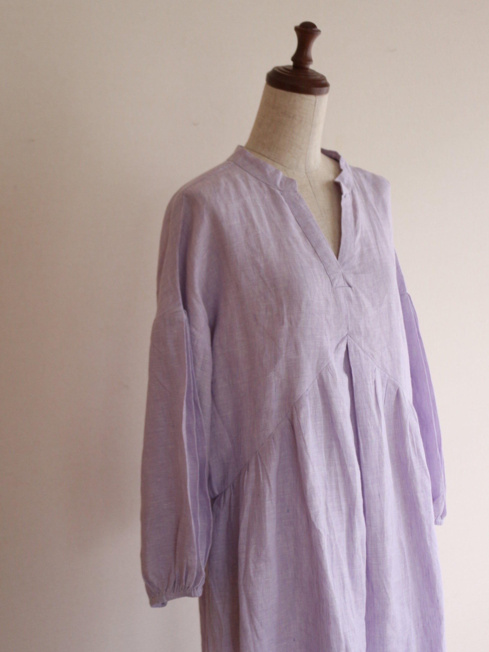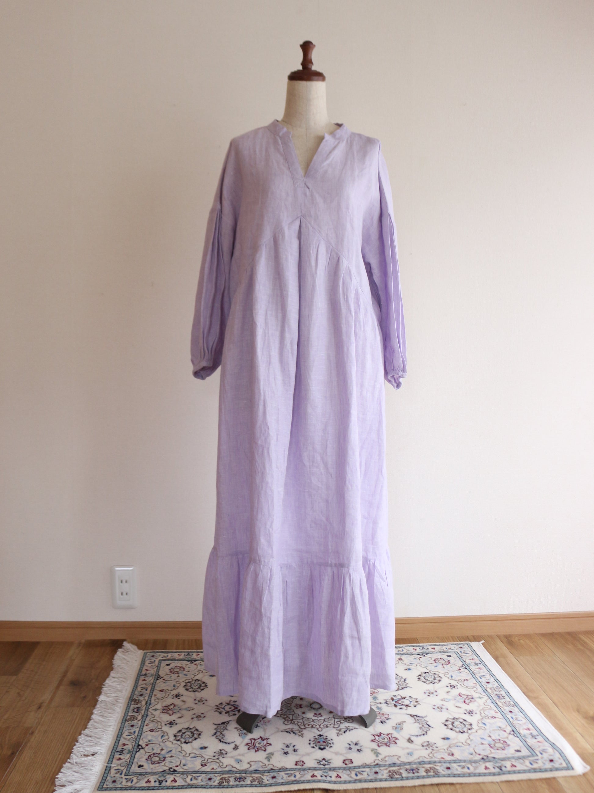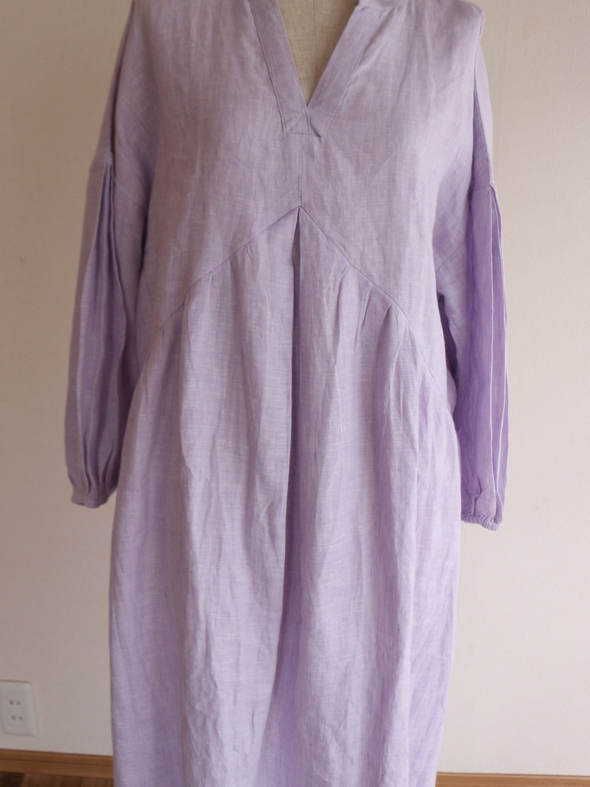 今回、こちらのワンピースを作るのに一番考えたコンセプトは「ゆるっと着れるのに、形が美しいもの」前身の山形の切り返しの部分にこだわりを持ってきたのですが、上過ぎても下過ぎても何だかシルエットがなんだか上手くはまらない。ちょうどよい高さに修正し足長効果を演出。前にギャザーを入れても何だかぼわっとするので真ん中に大きなタックと両脇にも大きなタックを入れてぼわつきを抑え。後ろの首元にギャザーを入れたかったのですが、やはり何だか後ろの生地がやっぱりぼわつくだぼつく、、、。そこで後ろの腰の位置にゴムを入れ後ろのダボつきを取り、体のラインを少し拾うようにして、後ろのシルエットを可愛くしました♪袖の部分にもタックを入れましたが、ただ可愛すぎるのも嫌なので控えめにしてあまり入れすぎないように。シンプルし過ぎないで、でも可愛すぎないで。大人が着れる華やかで、シルエットが美しいワンピースを一生懸命考えました。色が変わればまただいぶ雰囲気が変わるかと思います。今回は春の色味で大人の色味のミスティラベンダーを採用してみました♪