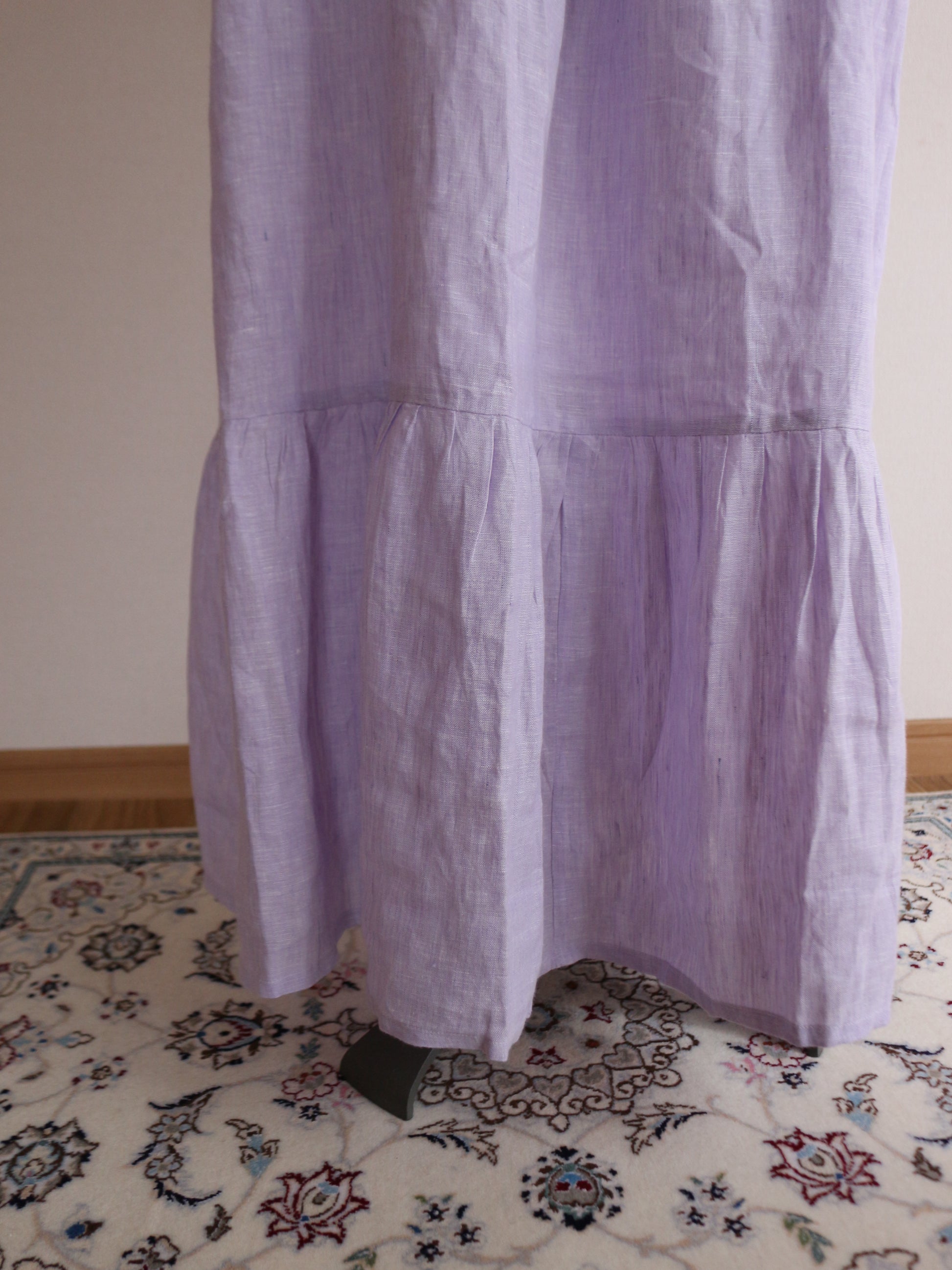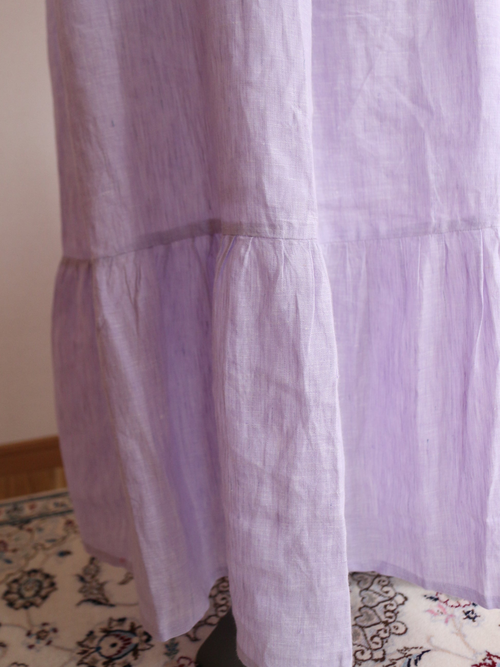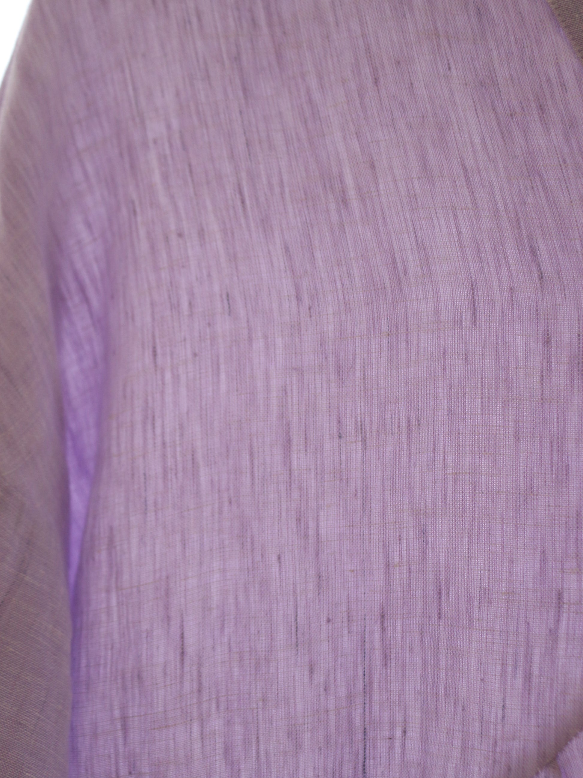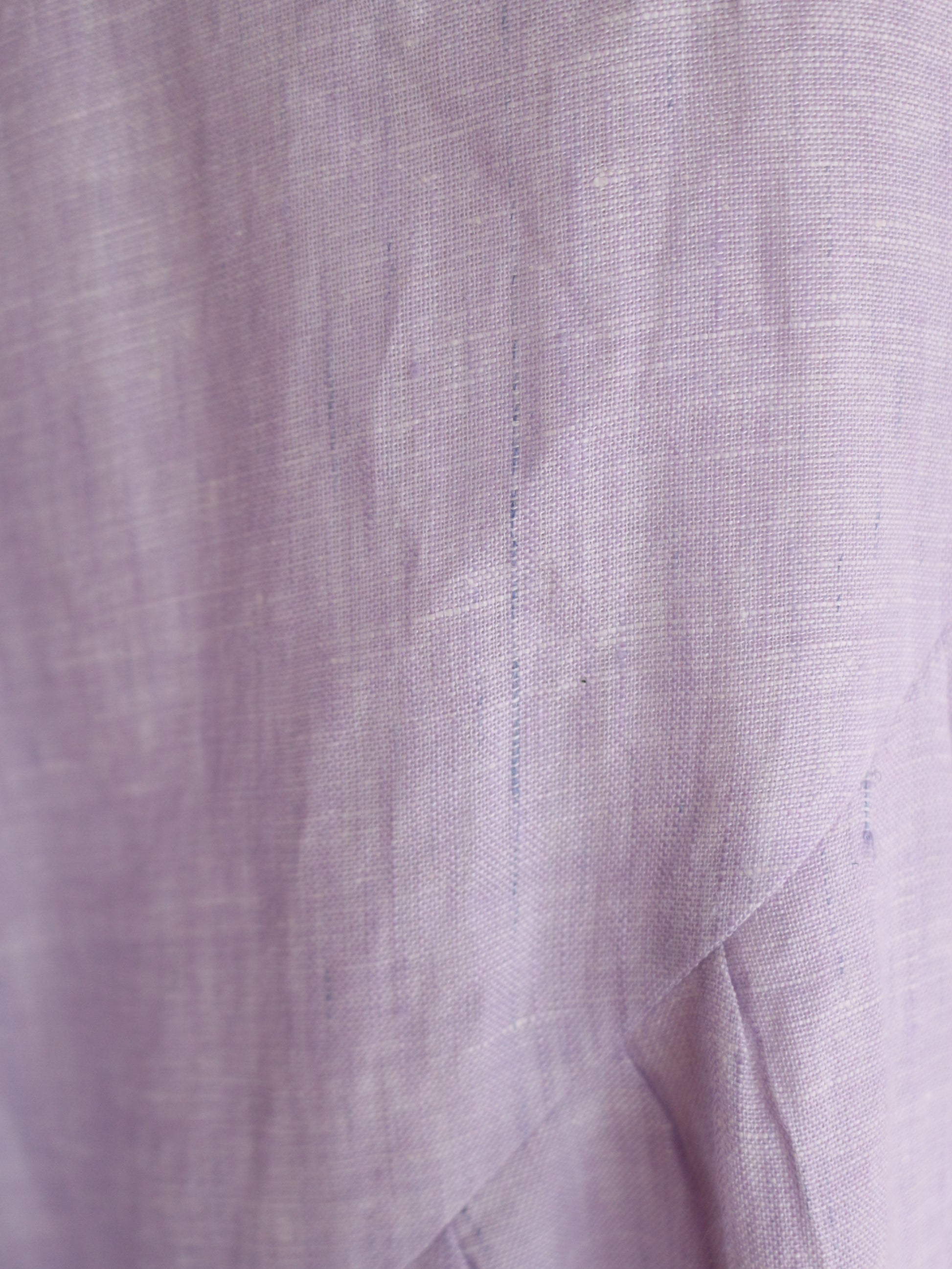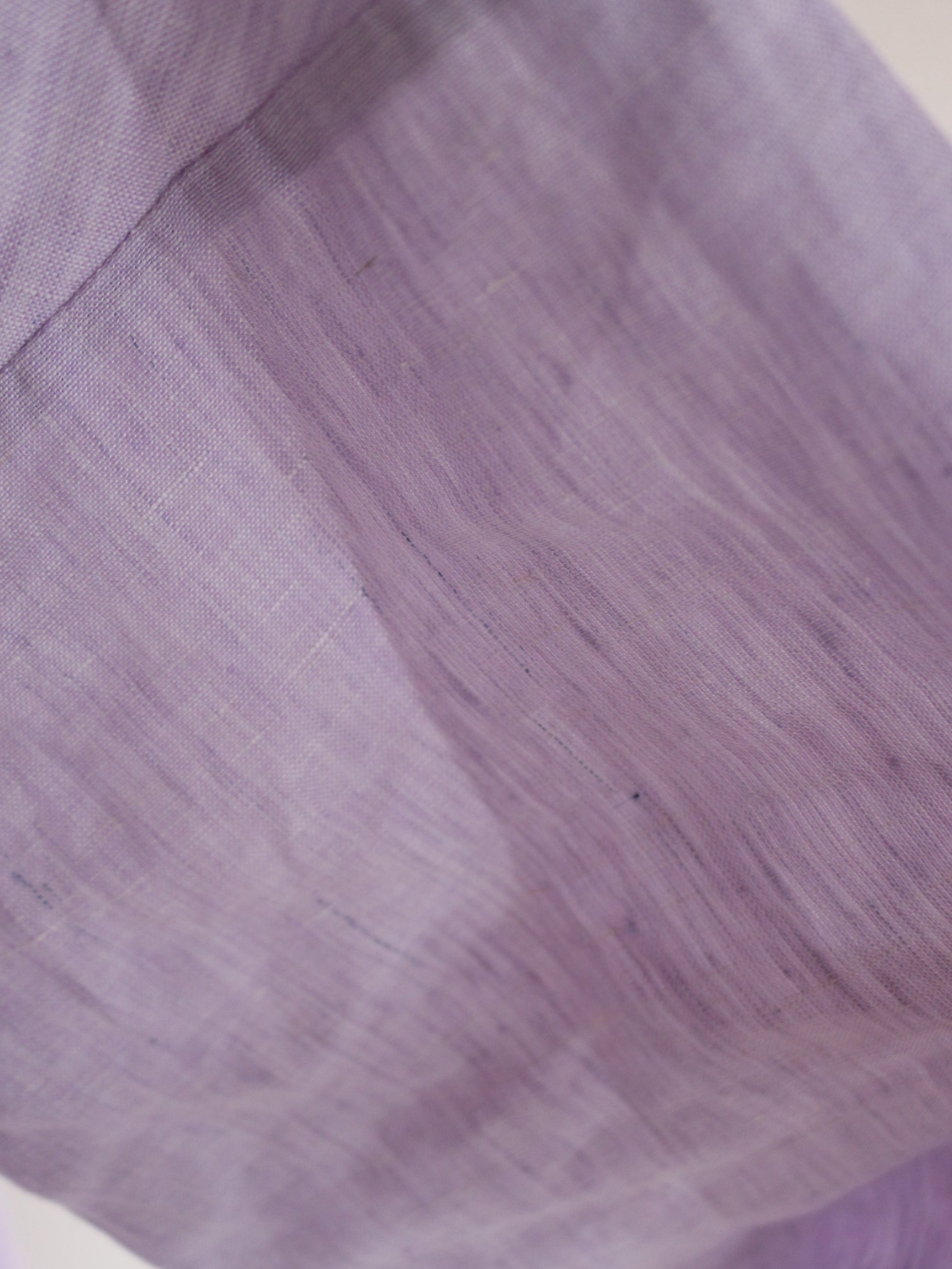とっても美しいラベンダーの色味。色味はとっても迷ったのですが、春と華やかな色味が、、、っと思って、こちらをチョイス。手元に来てみると何とも味わいのある色合いです。実はこのリネンは、ピンクやブルーのリネン糸を織り合わせています。単色でリネンを染めてないのよ!染めた糸を織り交ぜてるの!なので奥行きのある柔らかな色合いに。のっぺりしてないのよ!!!色が混じり合うので、絨毯のような揺らぎのあるグラデーションになり、本当に本当に美しい!なので、ところどころ、ブルーの色味が強く出てる部分があったりします。(Pic19-22)また、天然染料による小ロット生産のため、色にはわずかな個体差がございます。