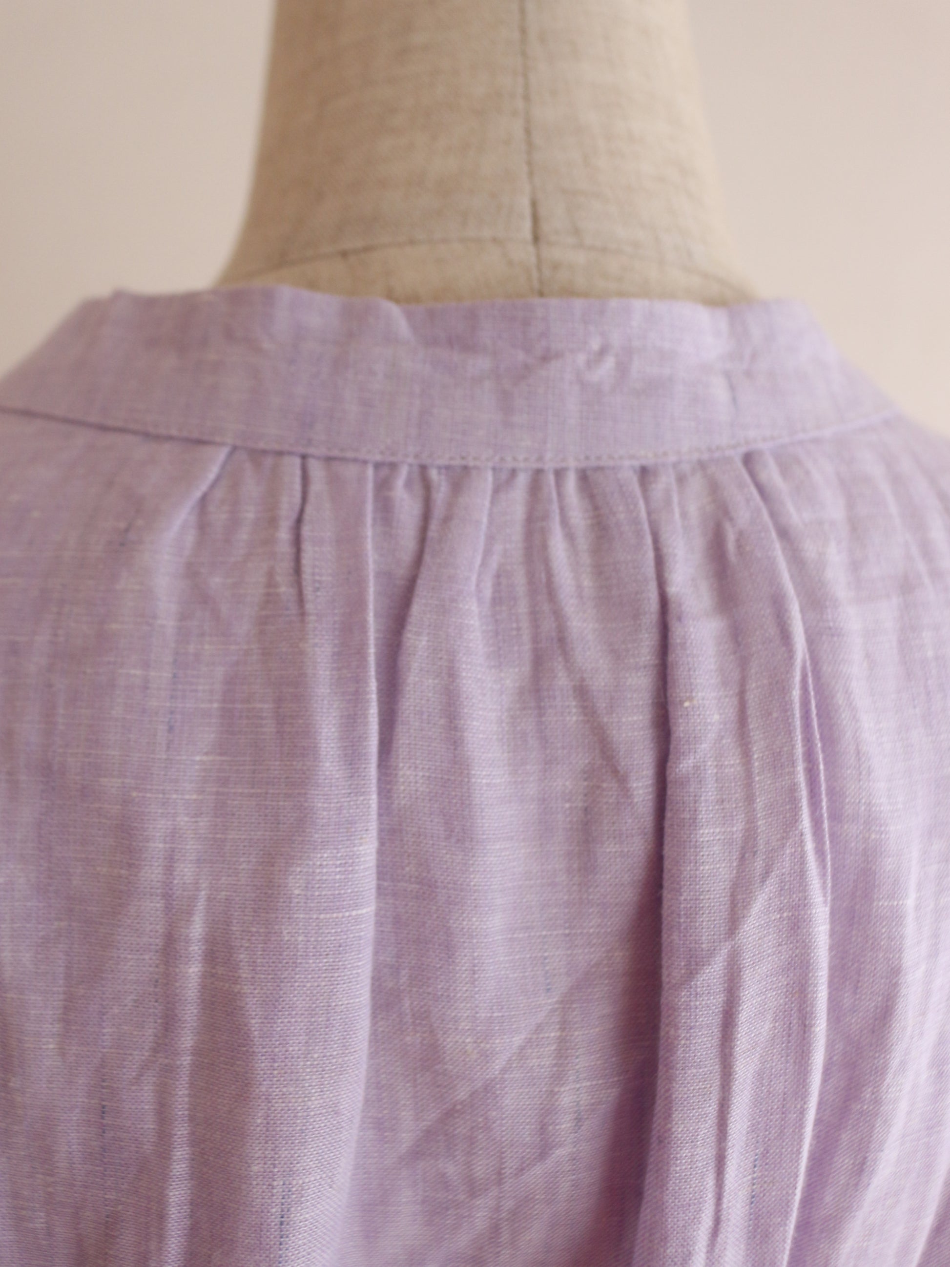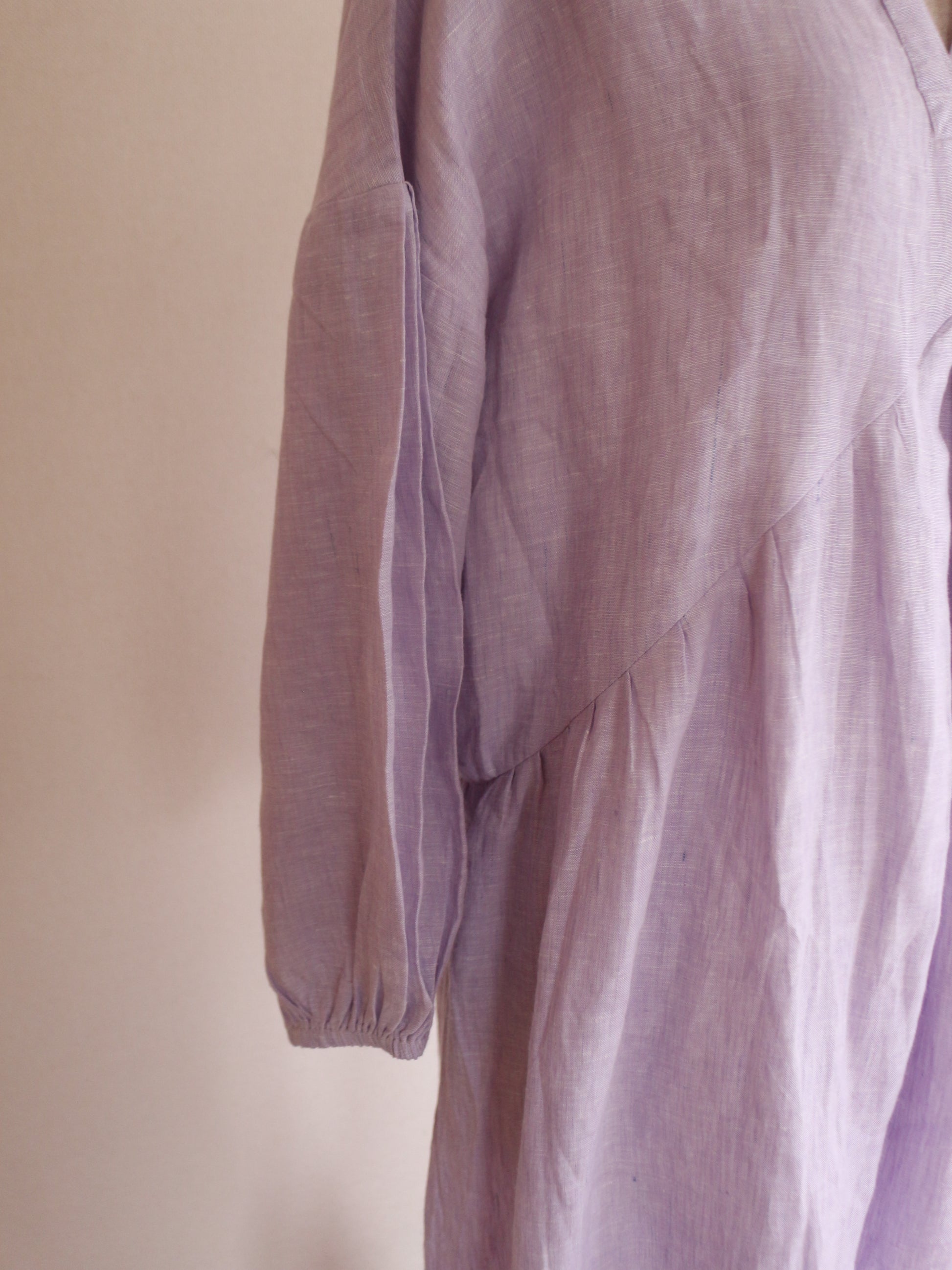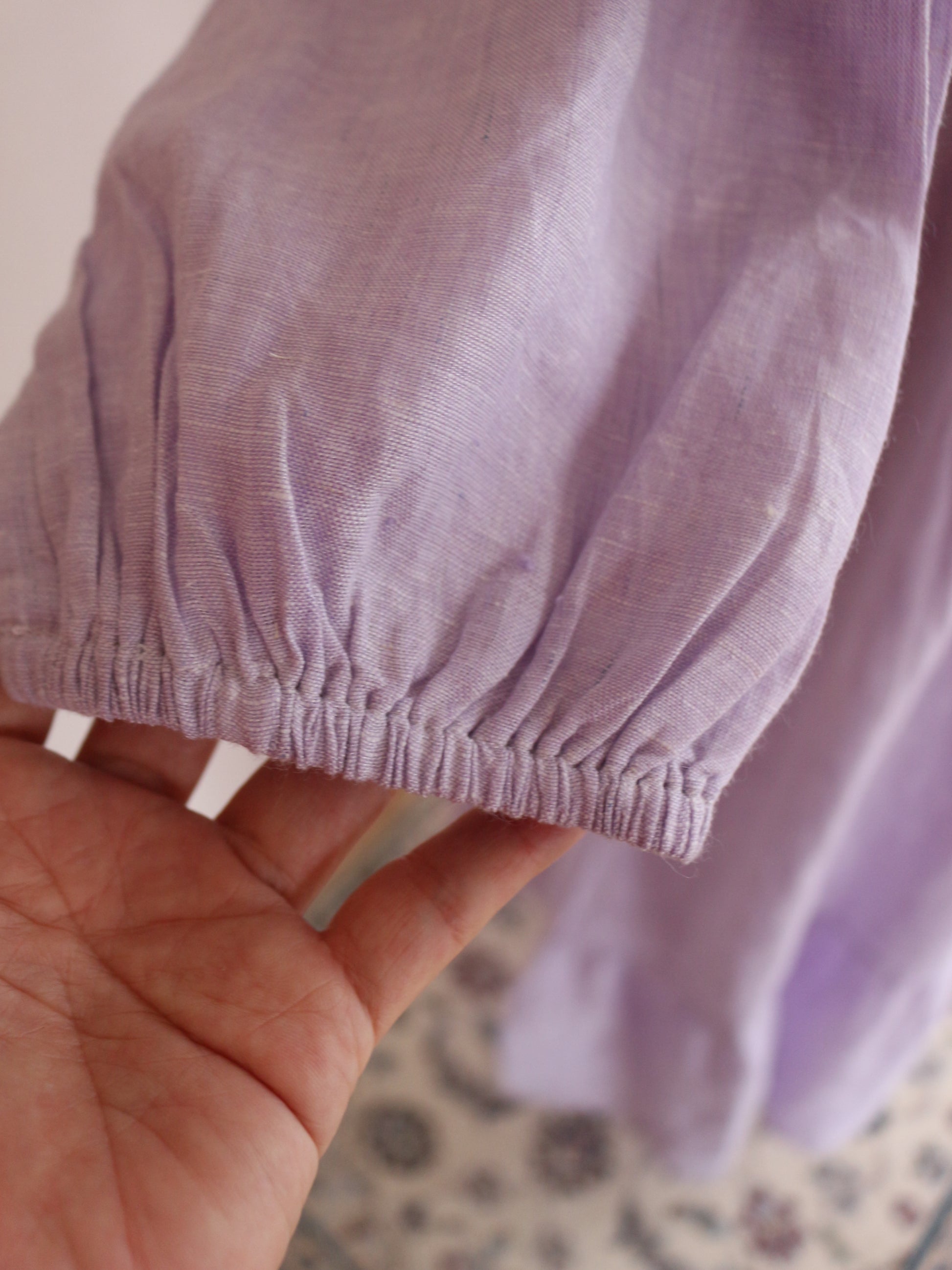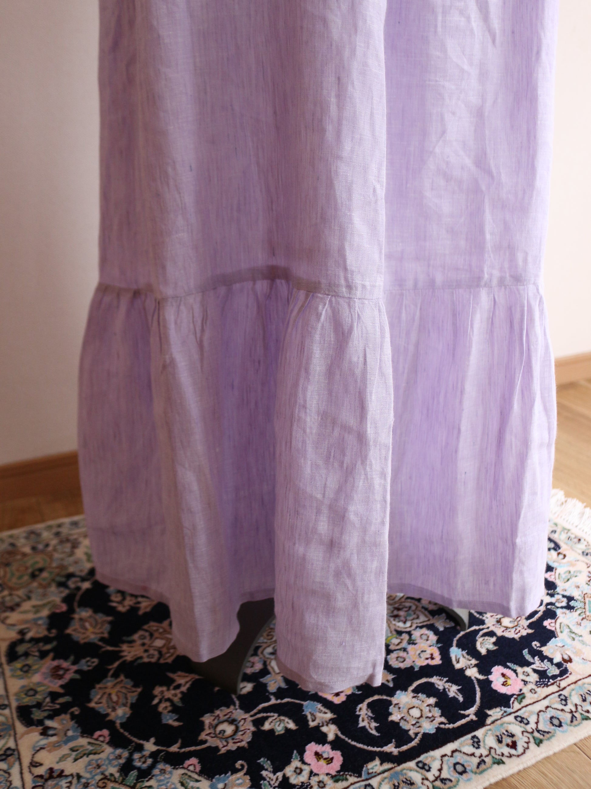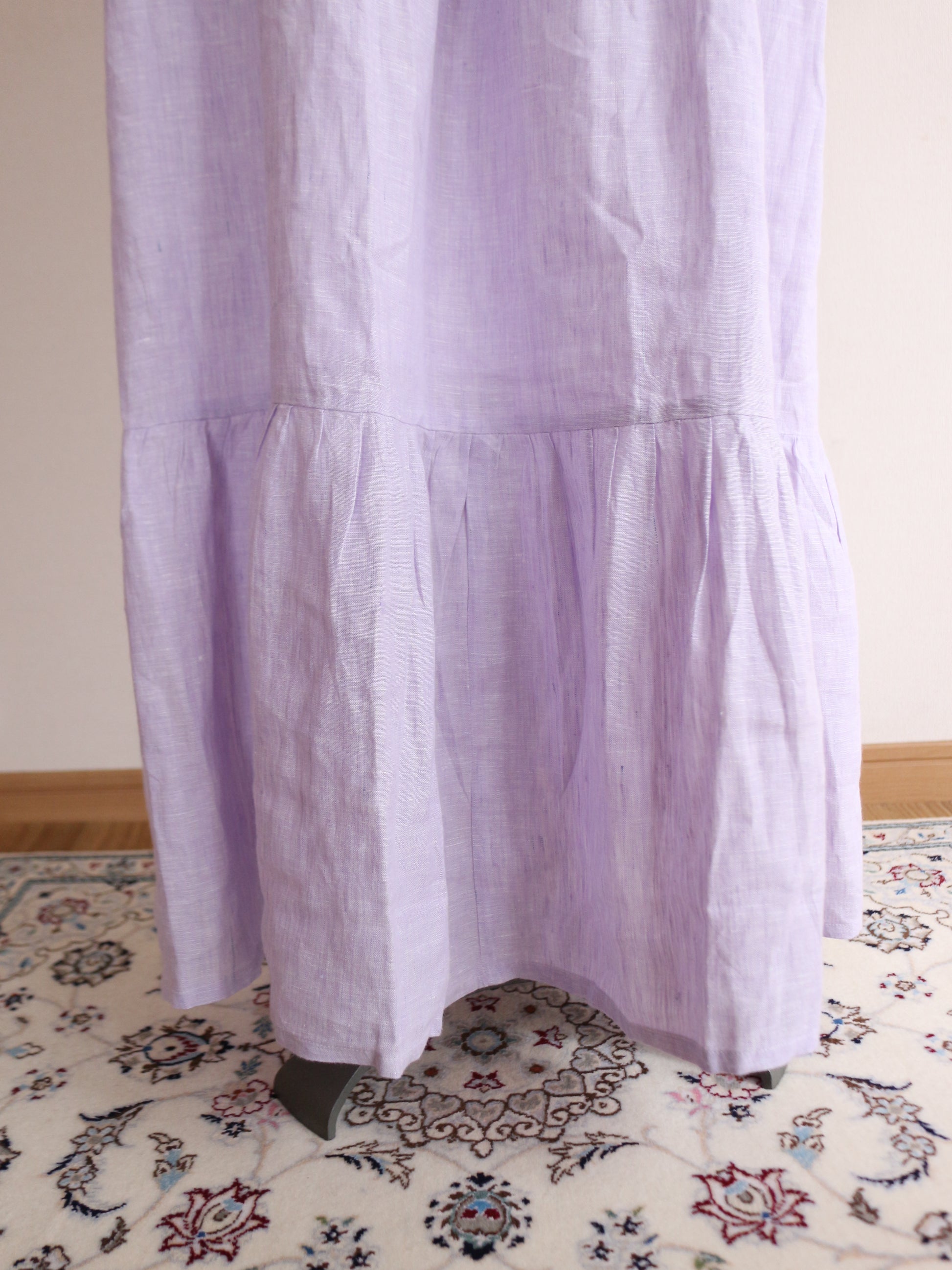 とっても美しいラベンダーの色味。色味はとっても迷ったのですが、春と華やかな色味が、、、っと思って、こちらをチョイス。手元に来てみると何とも味わいのある色合いです。実はこのリネンは、ピンクやブルーのリネン糸を織り合わせています。単色でリネンを染めてないのよ!染めた糸を織り交ぜてるの!なので奥行きのある柔らかな色合いに。のっぺりしてないのよ!!!色が混じり合うので、絨毯のような揺らぎのあるグラデーションになり、本当に本当に美しい!なので、ところどころ、ブルーの色味が強く出てる部分があったりします。(Pic19-22)また、天然染料による小ロット生産のため、色にはわずかな個体差がございます。