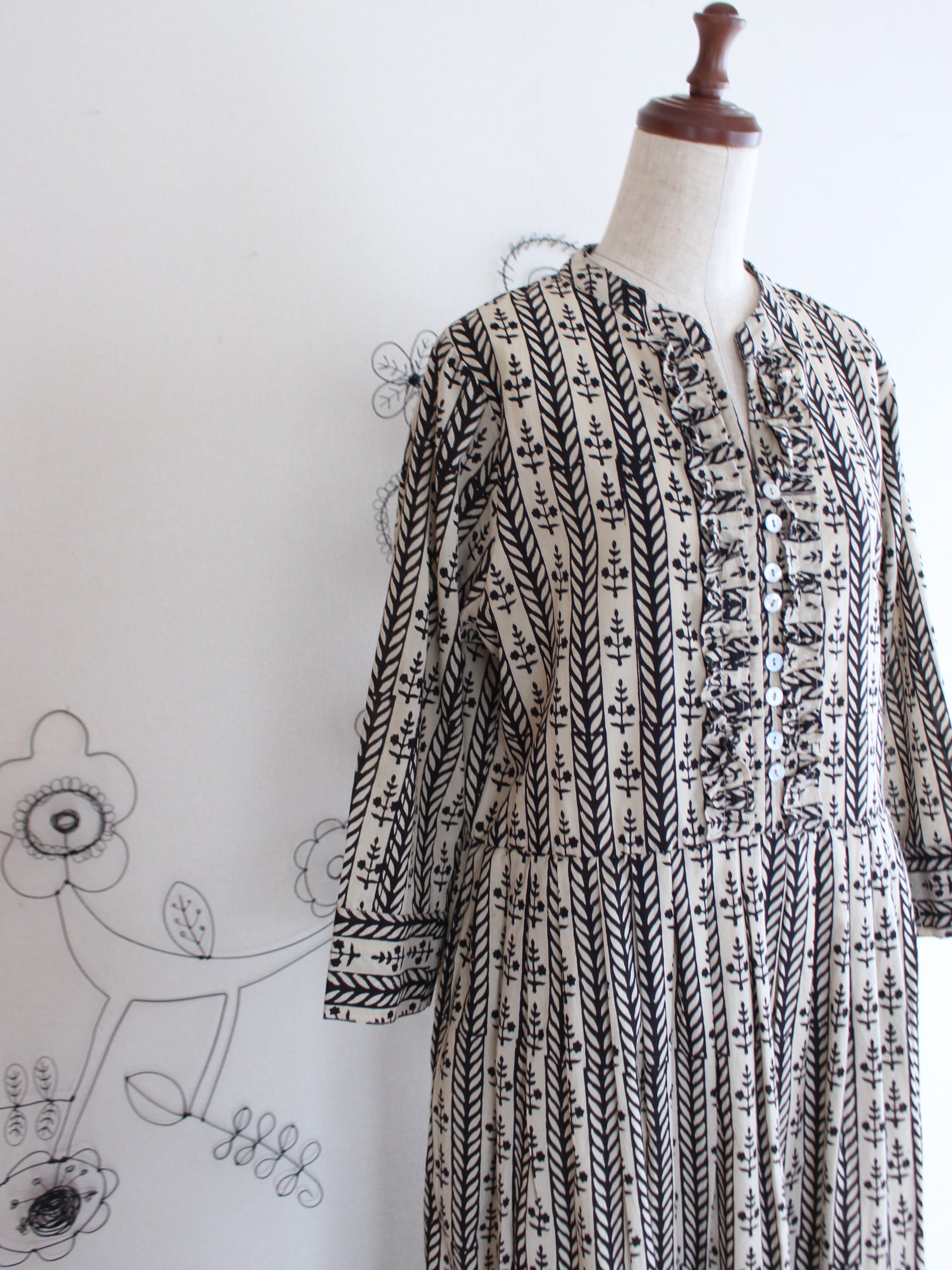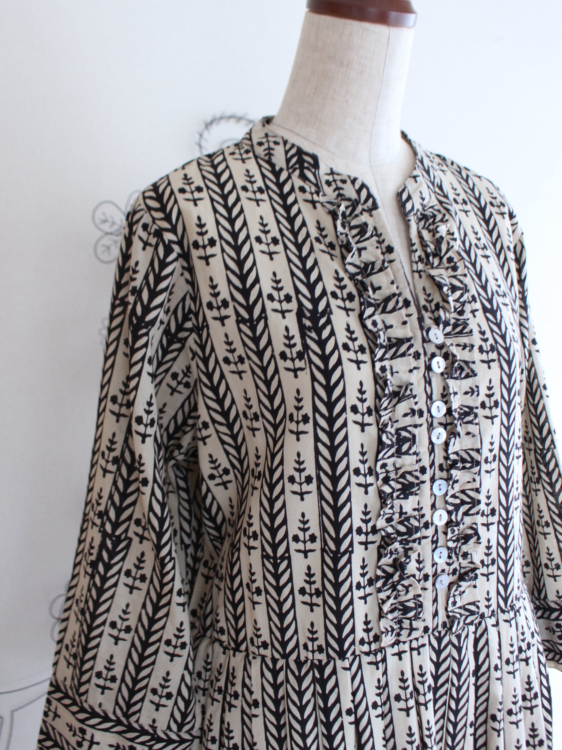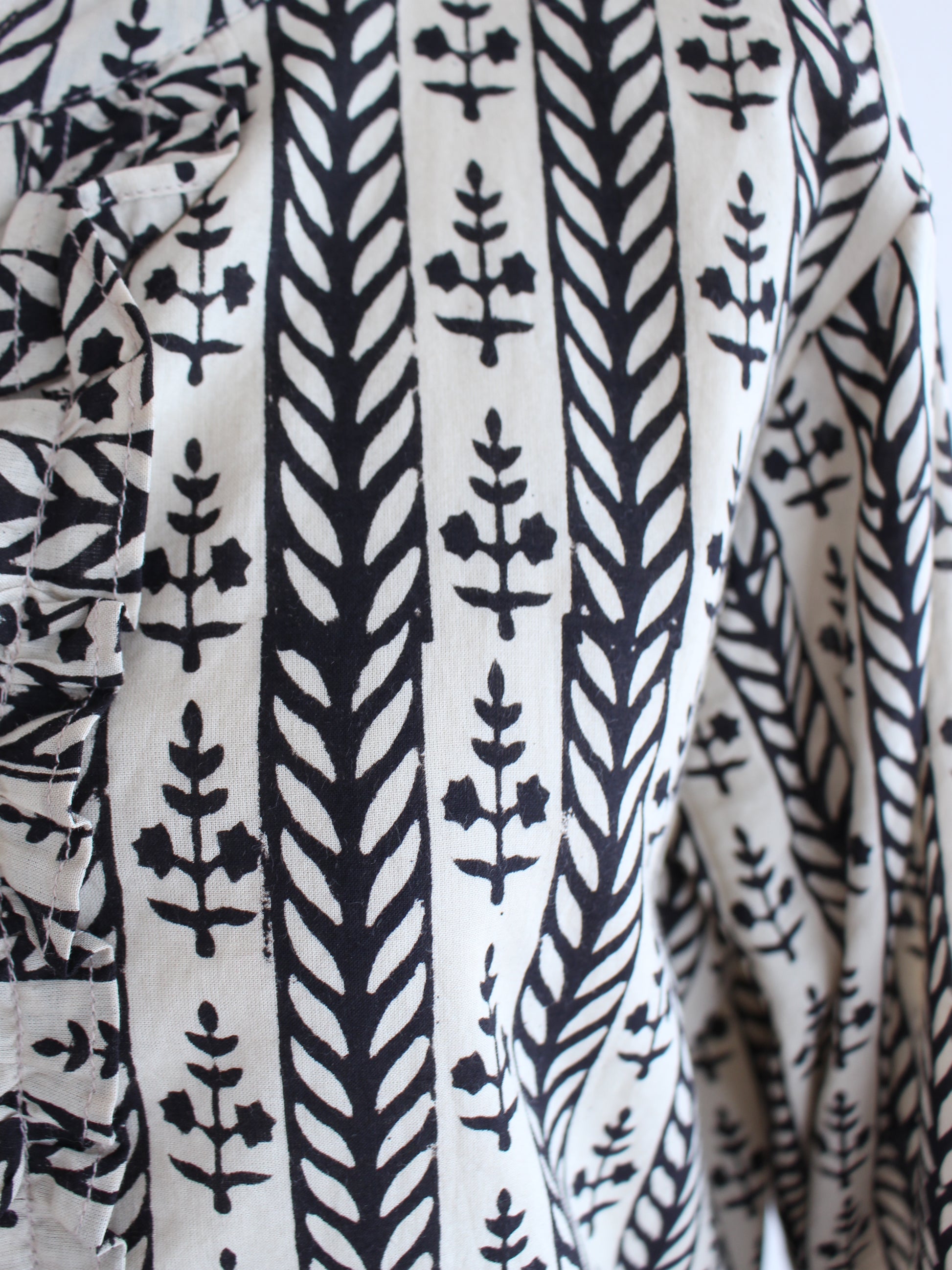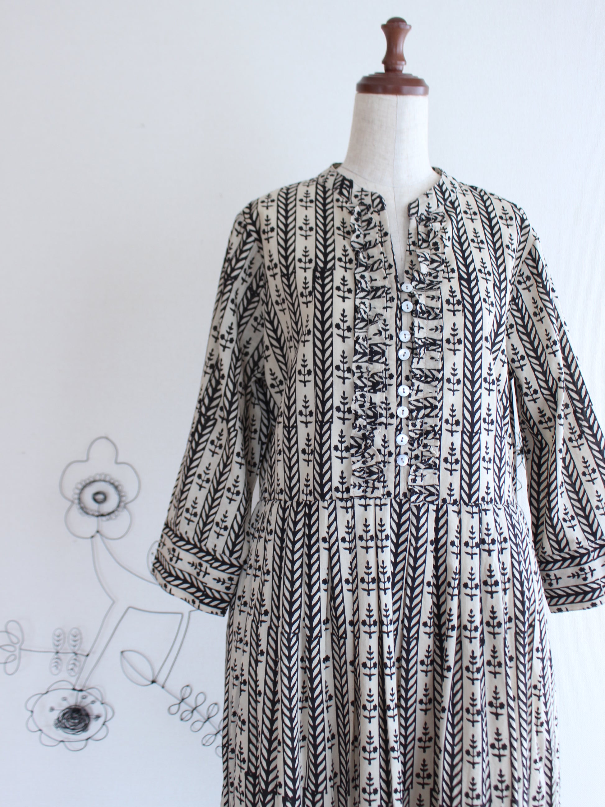 大人上品フリルワンピース。実はカフタン以上にものすごく時間を費やしたワンピースになります。このフリルの塩梅が本当に本当に難しい。フリルフリルしてしまうと、上品よりも、可愛らしい服になりがちで、難しい~っと何度も頭を抱えた一枚になります。インドの担当の女の子もまだ若いので、試作品が出てくるたびに可愛さが際立つ。もっとエレガントに!っもっと!もっと!Don’t Be Cute!と何度連呼したかわかりません。途中経過を何人にも見てもらったのですが、試作品の生地はオーダー生地とは違い、インドの担当の子がチョイスした可愛い生地で作成するため、見せられた友人も、、、???っとなっていました。ここら辺は何度となく作った私の勘頼りですね。自分が選んだ生地で出来た瞬間、よっし、いける!!!よーやく大人上品フリルに出来上がった!っとガッツポーズでした。