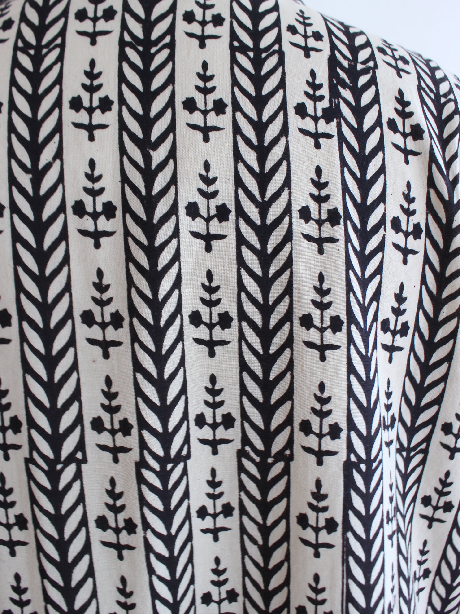 ブロックプリントとは職人さんが木製の型(スタンプ)を手で押し当てながら、何度も色柄を重ねていくインドの伝統的なプリントのことになります。1枚の生地を作るのに10日から14日ほどかかります。