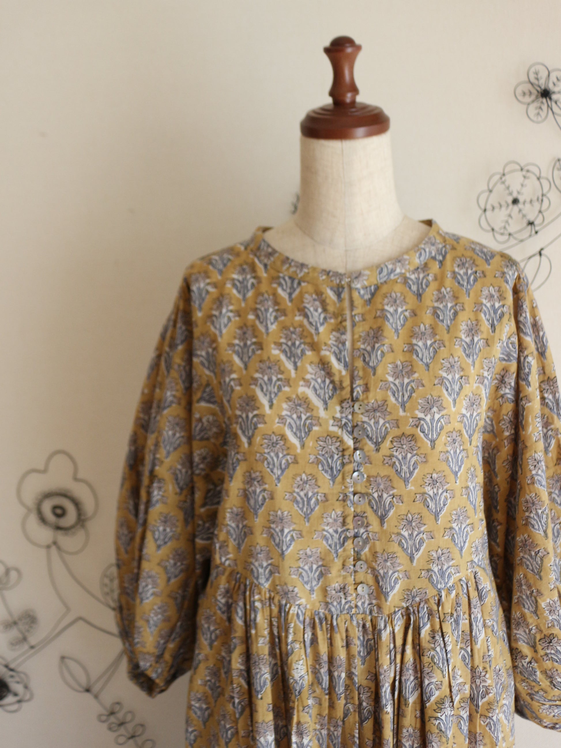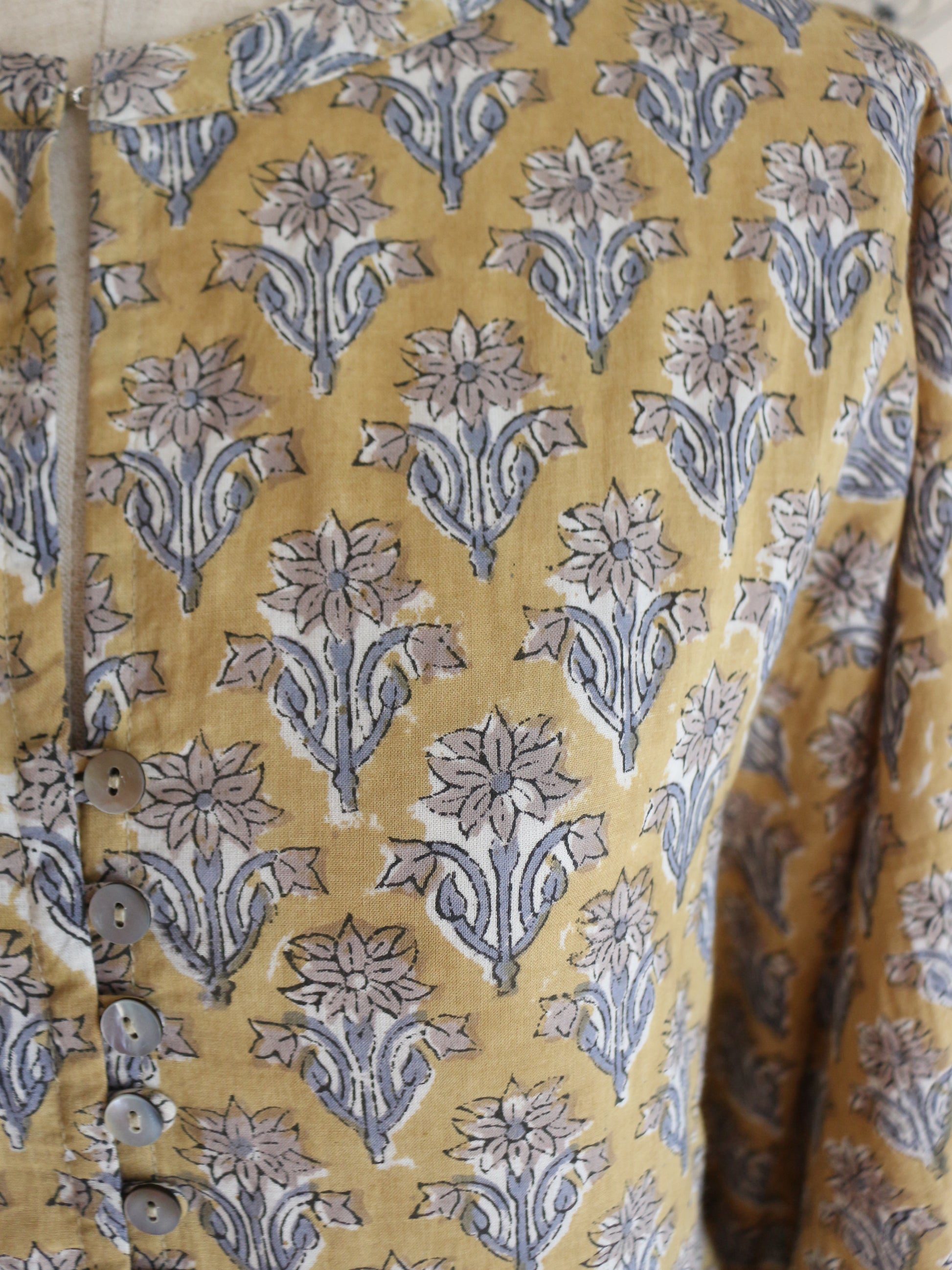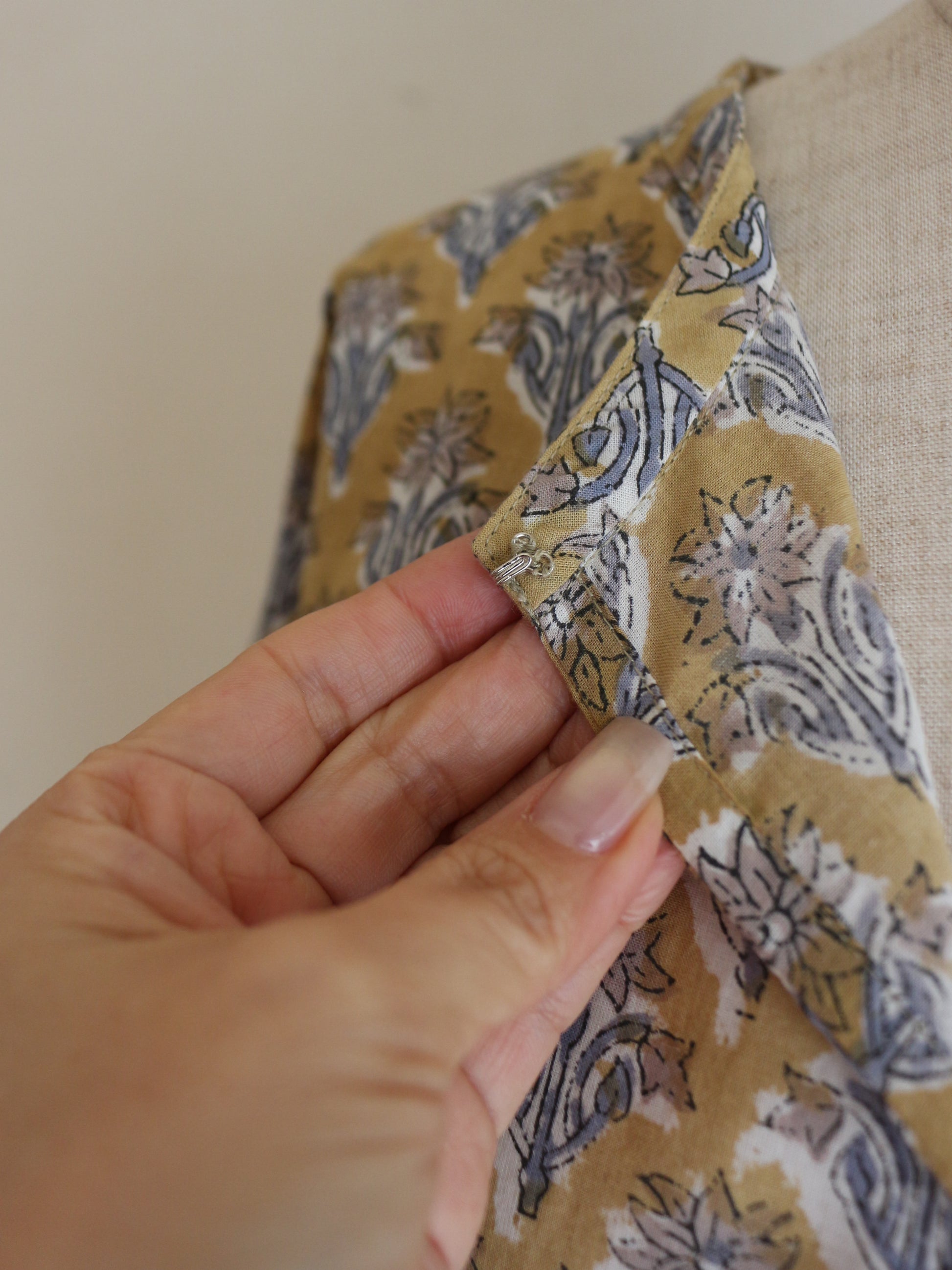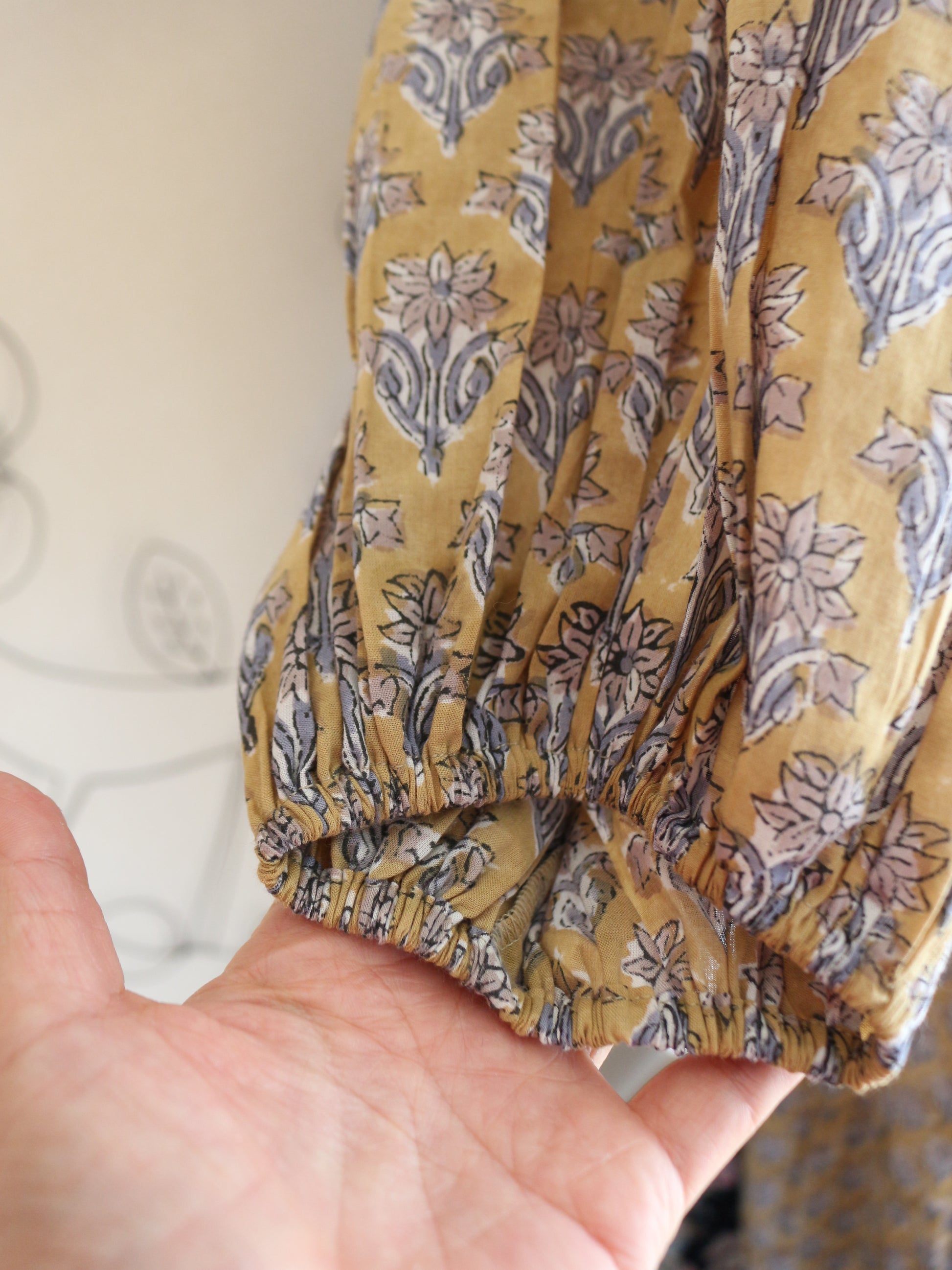 ブロックプリントは洗濯を重ねたり日を浴びると色落ちや退色します!ただ、古着好きの人に、良い色とくたびれ感ですねぇ‼っと先日とても褒めていただけました。自然染料なので日を浴びると退色しますが、この感じがお好きな方がいるんだぁっと、退色した色味を手放せずに着ていても、褒められることがございました。着すぎてクタクタなのでそろそろ手放そうと思った1枚ですが、まだいけるか?笑 生きた色と呼ばれる自然染料をお楽しみいただけたら幸いです。
