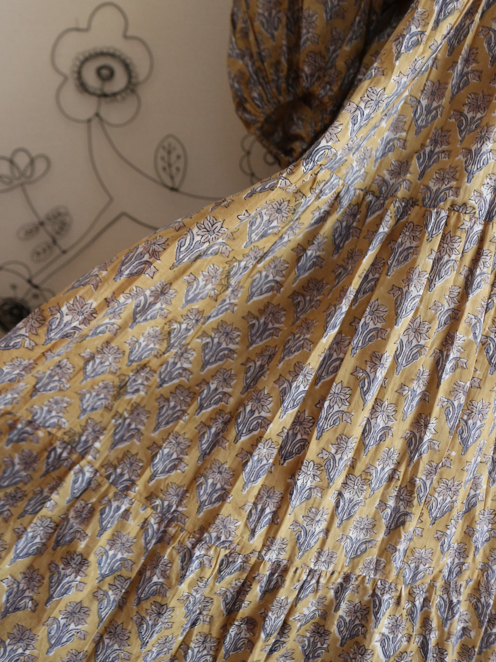 ブロックプリントとは職人さんが木製の型(スタンプ)を手で押し当てながら、何度も色柄を重ねていくインドの伝統的なプリントのことになります。1枚の生地を作るのに10日から14日ほどかかります。