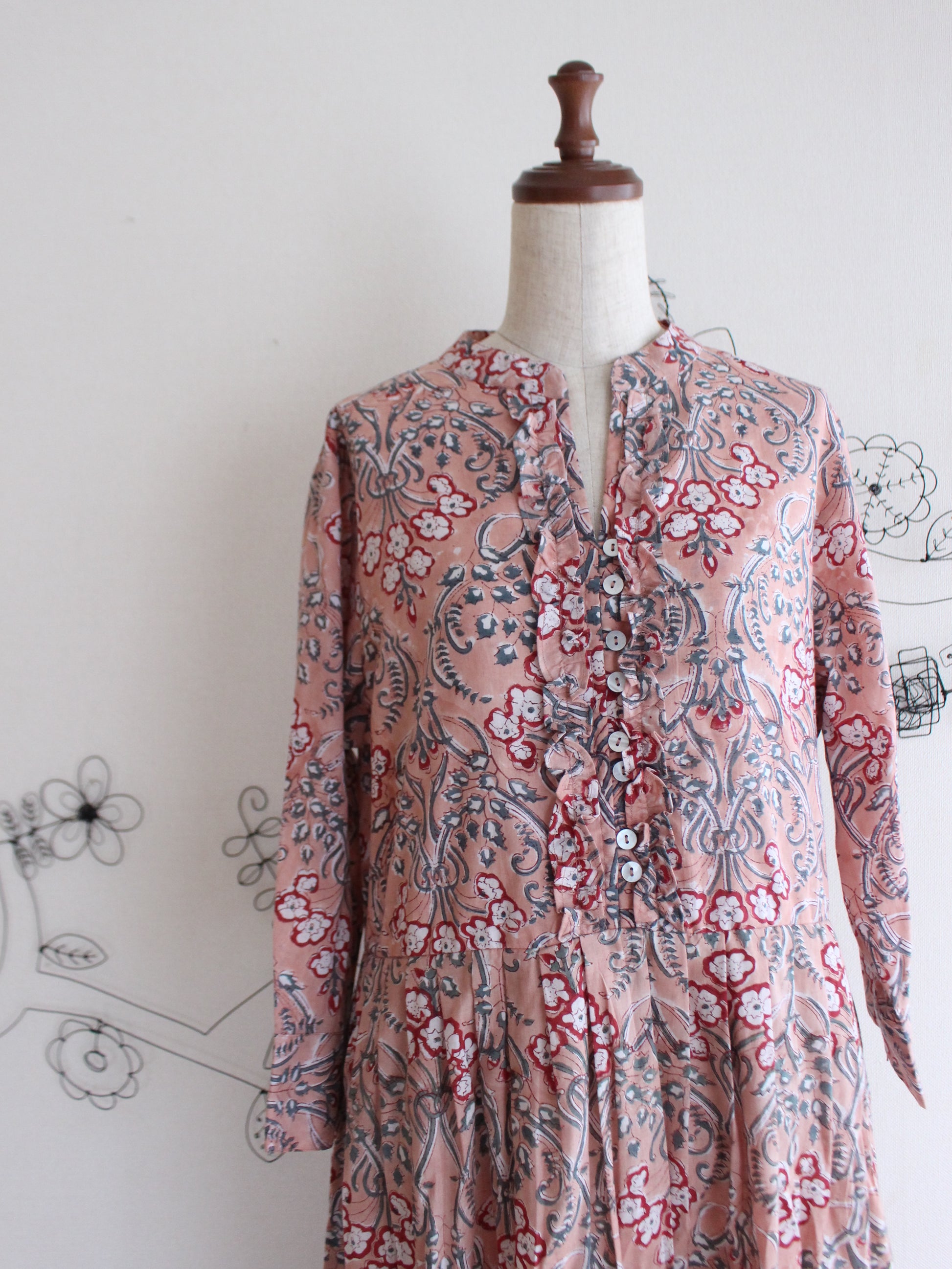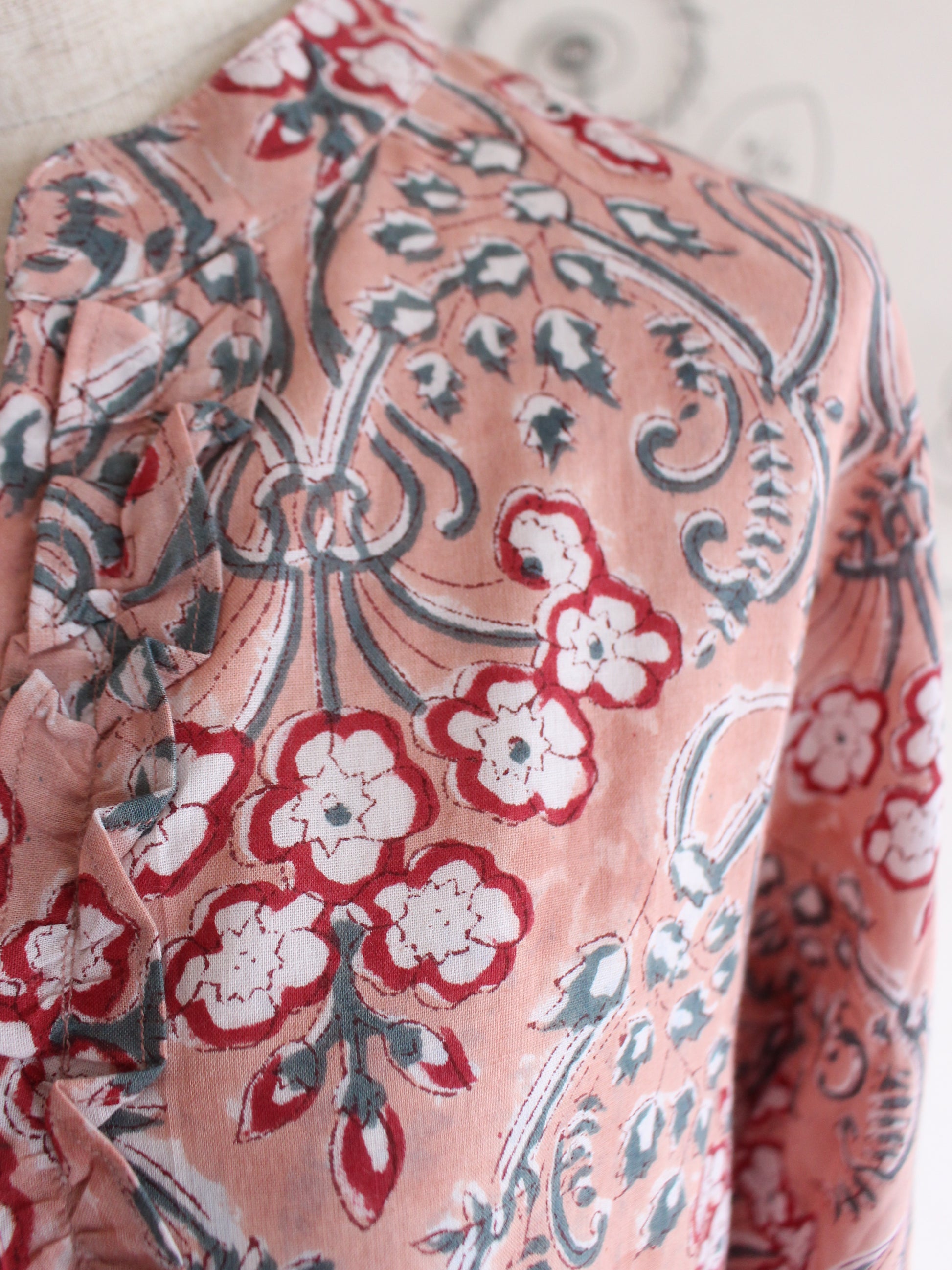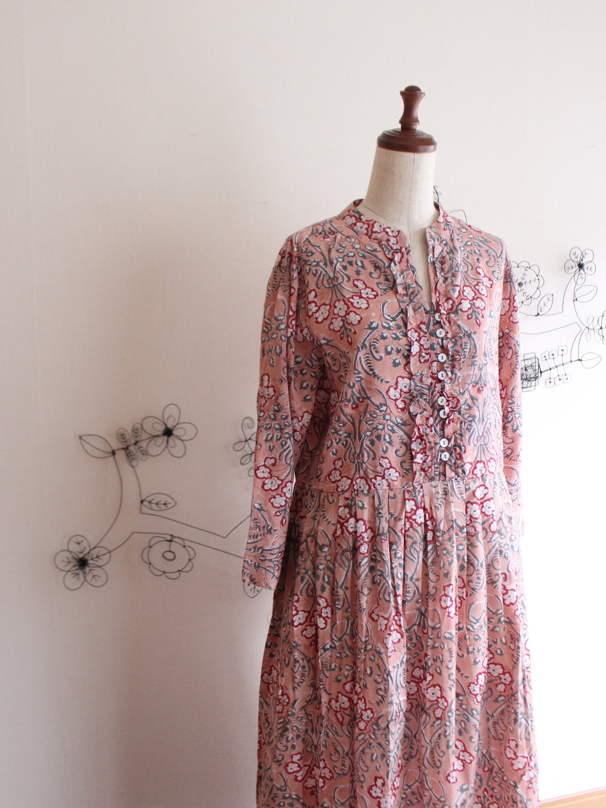 大人上品フリルワンピース。実はカフタン以上にものすごく時間を費やしたワンピースになります。このフリルの塩梅が本当に本当に難しい。フリルフリルしてしまうと、上品よりも、可愛らしい服になりがちで、難しい~っと何度も頭を抱えた一枚になります。インドの担当の女の子もまだ若いので、試作品が出てくるたびに可愛さが際立つ。もっとエレガントに!っもっと!もっと!Don’t Be Cute!と何度連呼したかわかりません。途中経過を何人にも見てもらったのですが、試作品の生地はオーダー生地とは違い、インドの担当の子がチョイスした可愛い生地で作成するため、見せられた友人も、、、???っとなっていました。ここら辺は何度となく作った私の勘頼りですね。自分が選んだ生地で出来た瞬間、よっし、いける!!!よーやく大人上品フリルに出来上がった!っとガッツポーズでした。