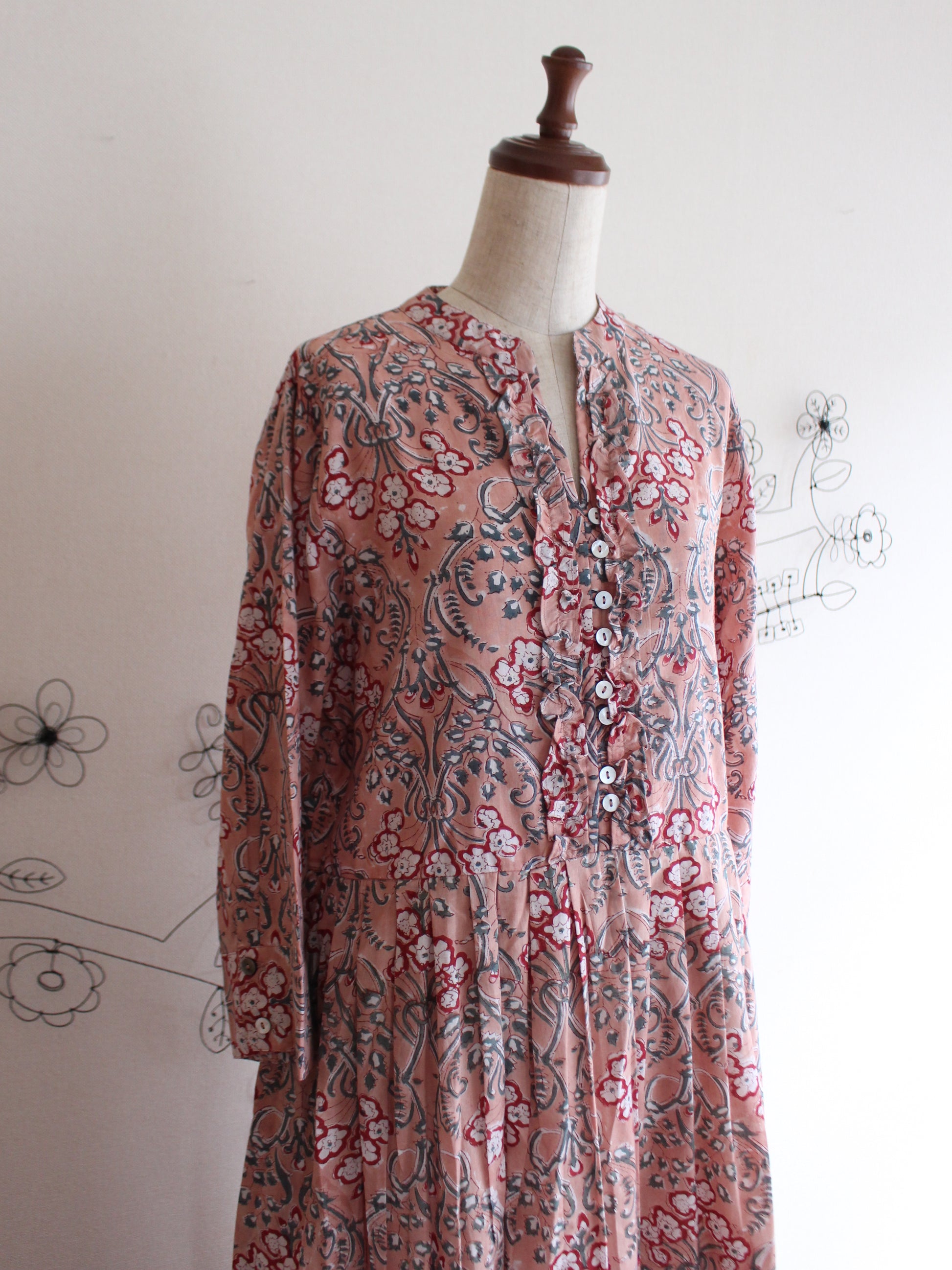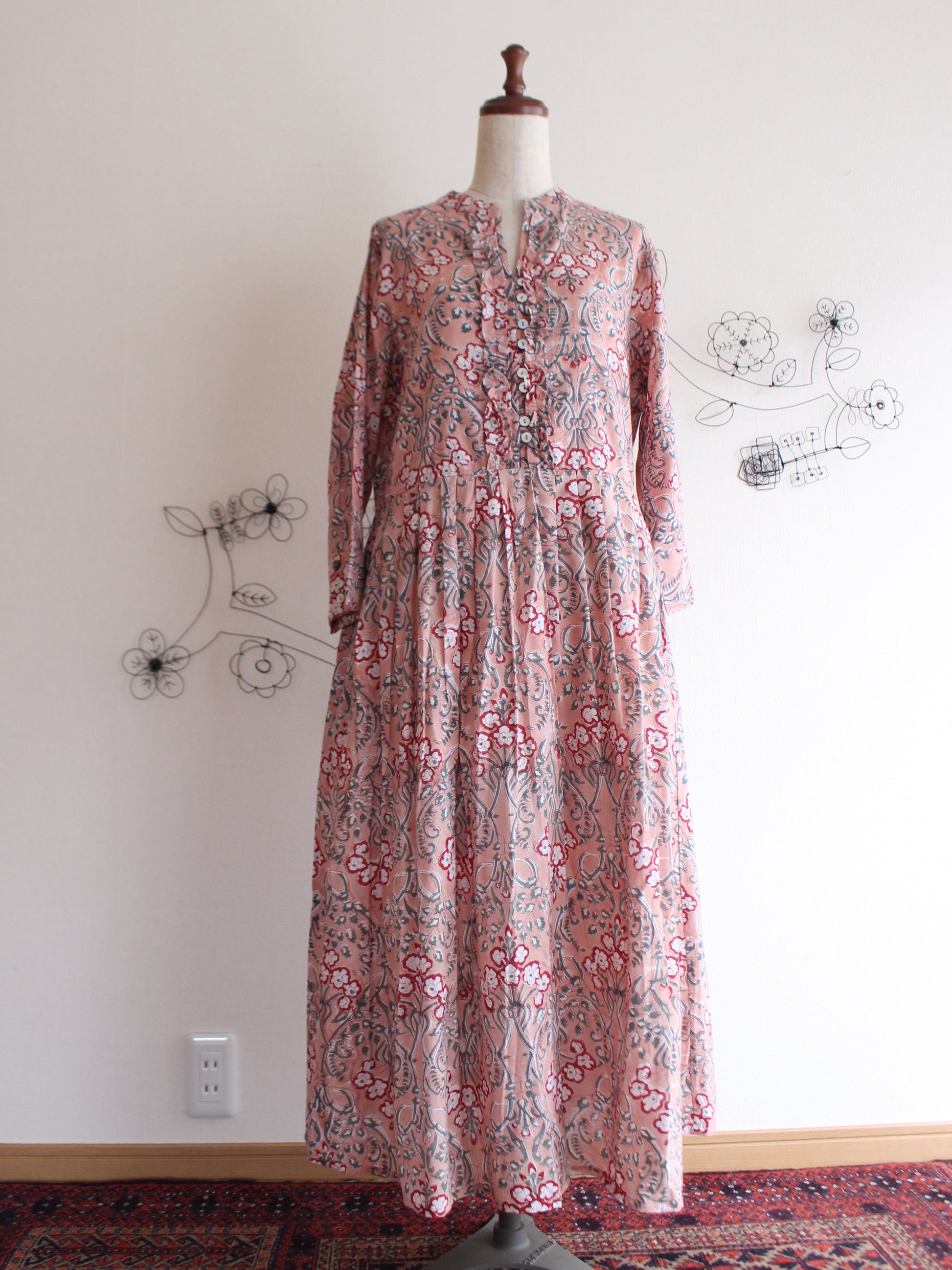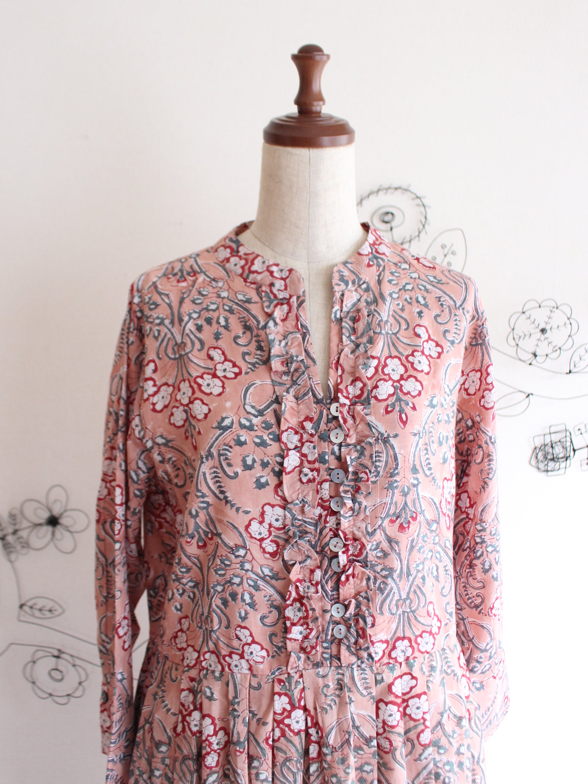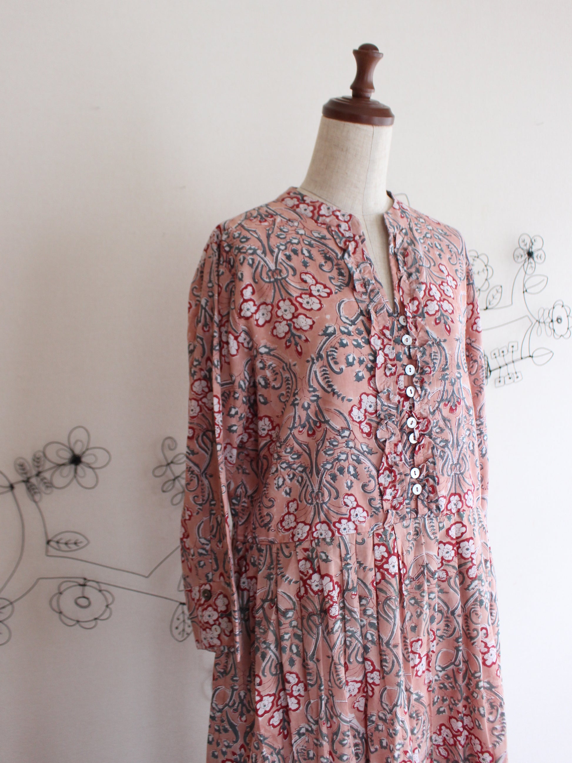大人上品フリルワンピース。実はカフタン以上にものすごく時間を費やしたワンピースになります。このフリルの塩梅が本当に本当に難しい。フリルフリルしてしまうと、上品よりも、可愛らしい服になりがちで、難しい~っと何度も頭を抱えた一枚になります。インドの担当の女の子もまだ若いので、試作品が出てくるたびに可愛さが際立つ。もっとエレガントに!っもっと!もっと!Don’t Be Cute!と何度連呼したかわかりません。途中経過を何人にも見てもらったのですが、試作品の生地はオーダー生地とは違い、インドの担当の子がチョイスした可愛い生地で作成するため、見せられた友人も、、、???っとなっていました。ここら辺は何度となく作った私の勘頼りですね。自分が選んだ生地で出来た瞬間、よっし、いける!!!よーやく大人上品フリルに出来上がった!っとガッツポーズでした。