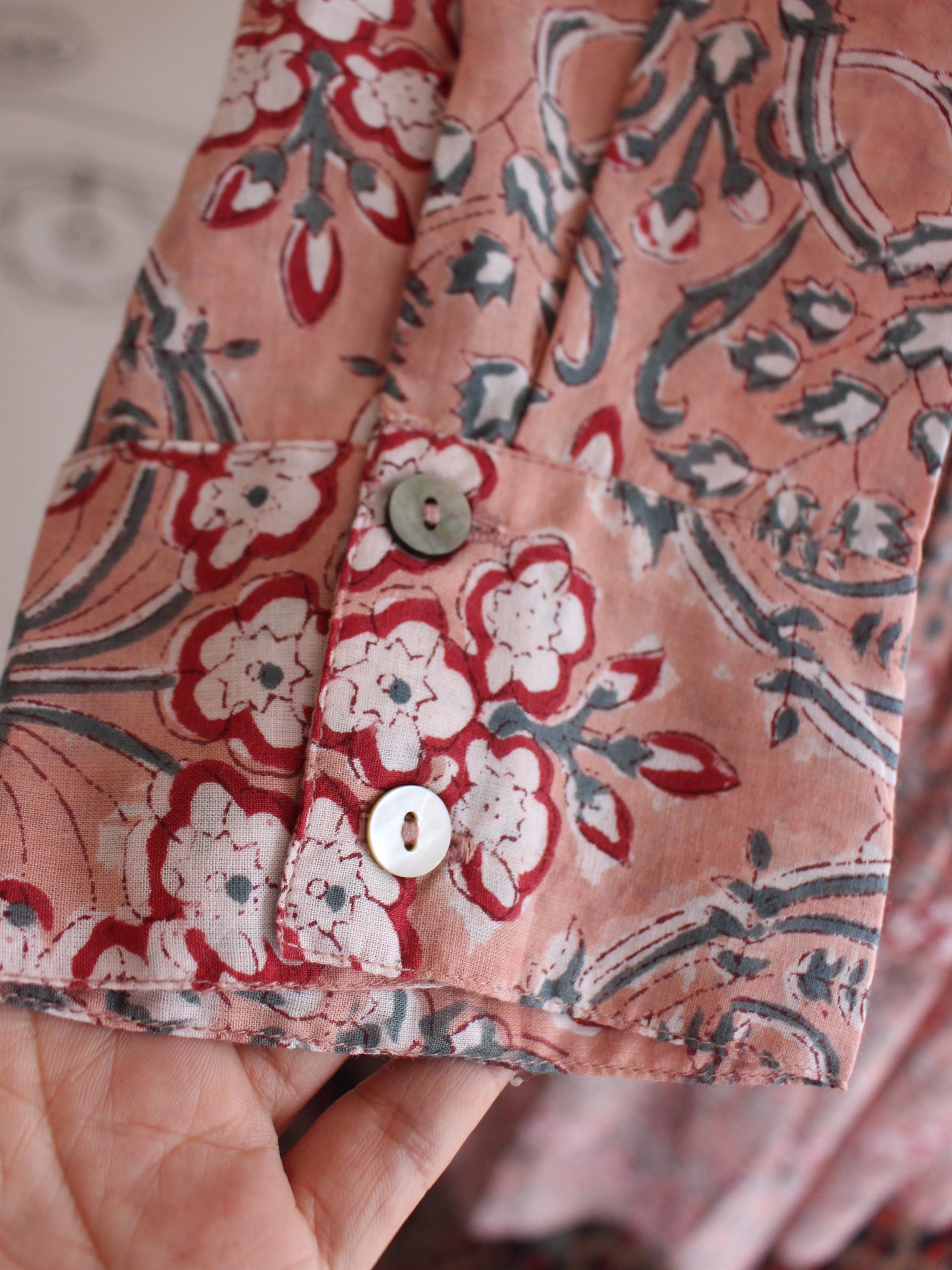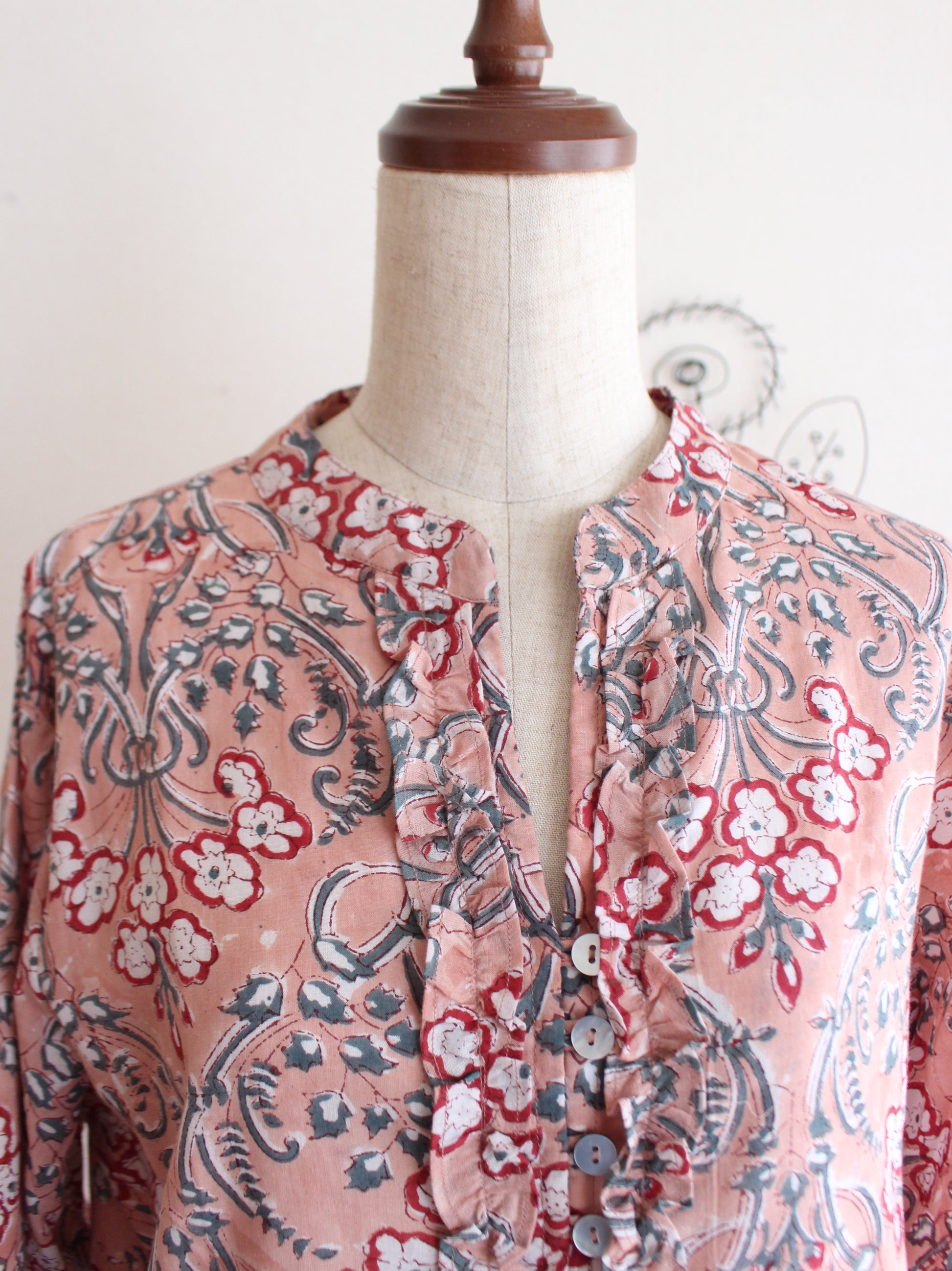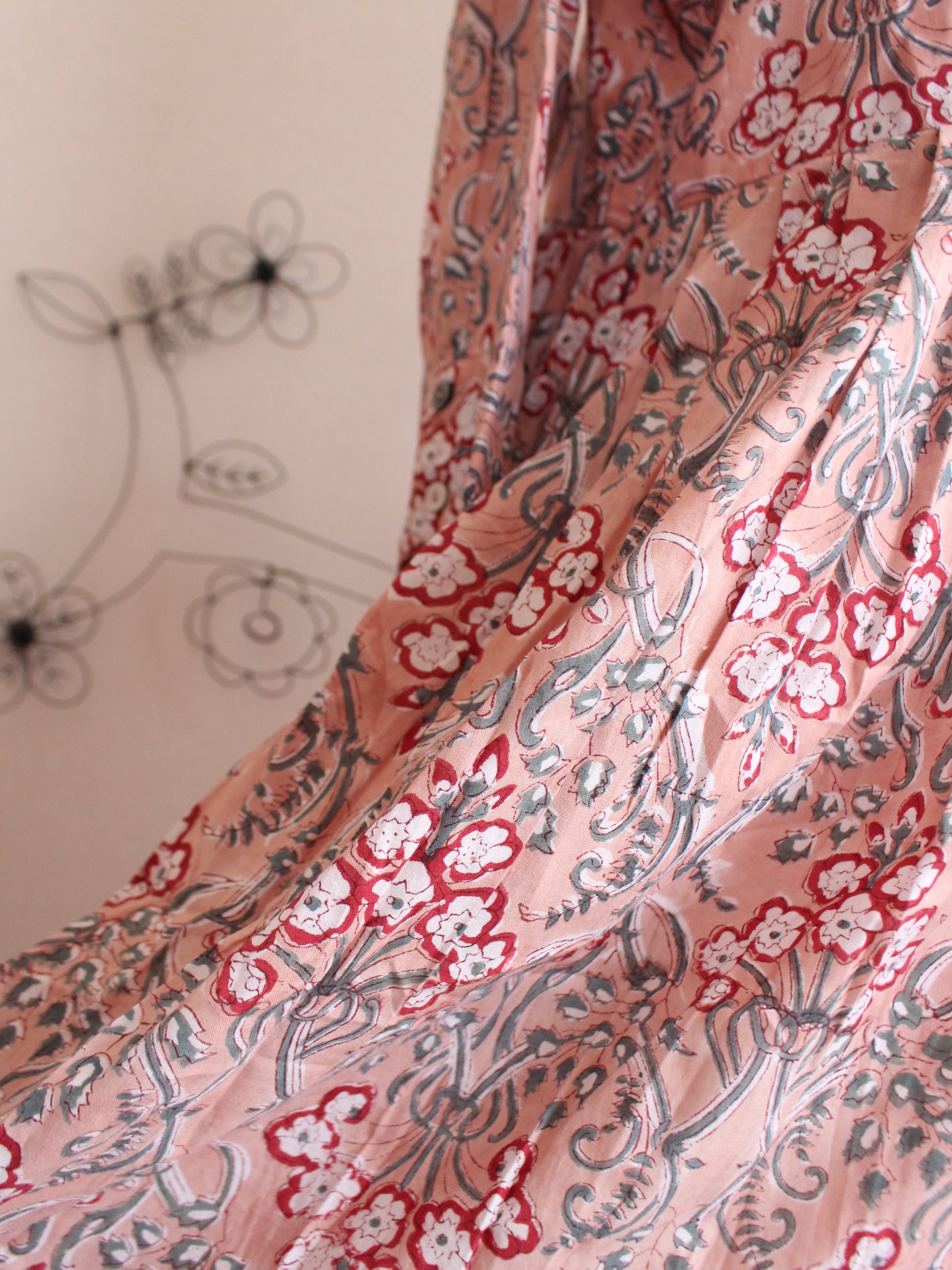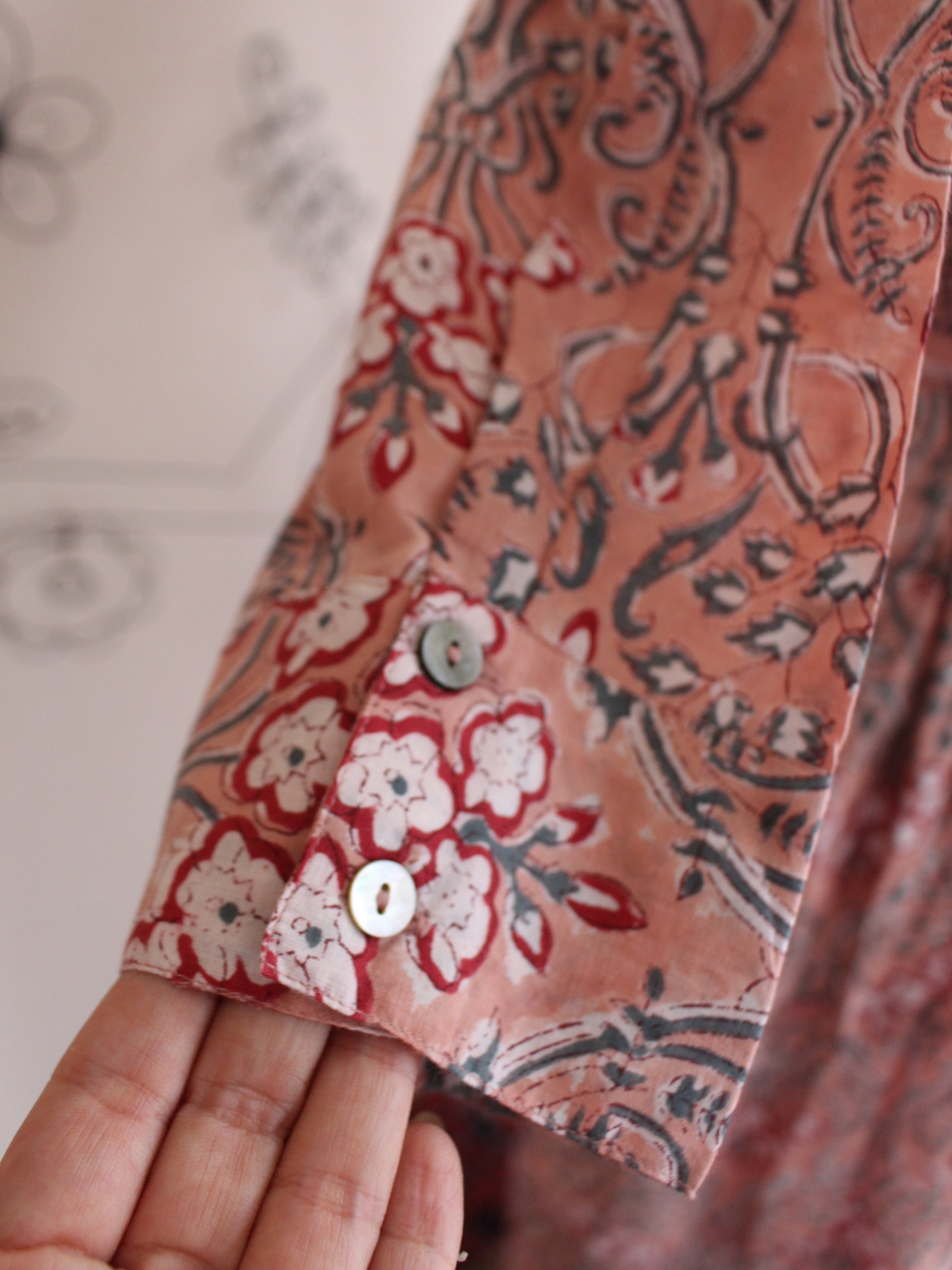 ブロックプリントとは職人さんが木製の型(スタンプ)を手で押し当てながら、何度も色柄を重ねていくインドの伝統的なプリントのことになります。1枚の生地を作るのに10日から14日ほどかかります。