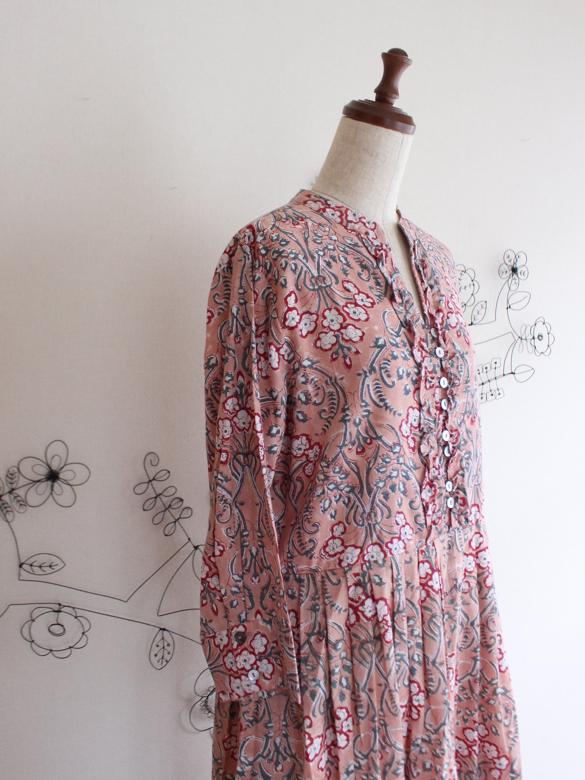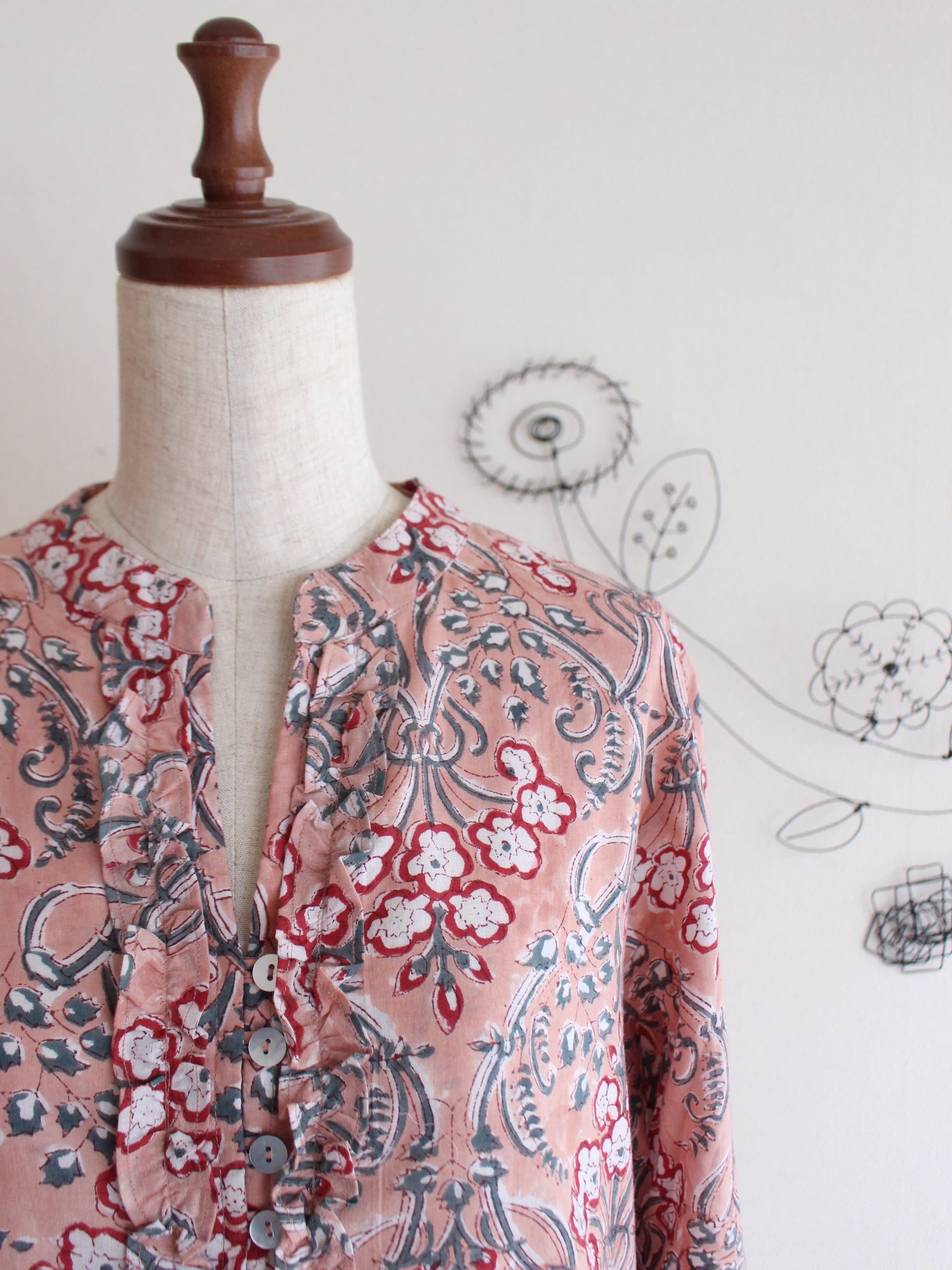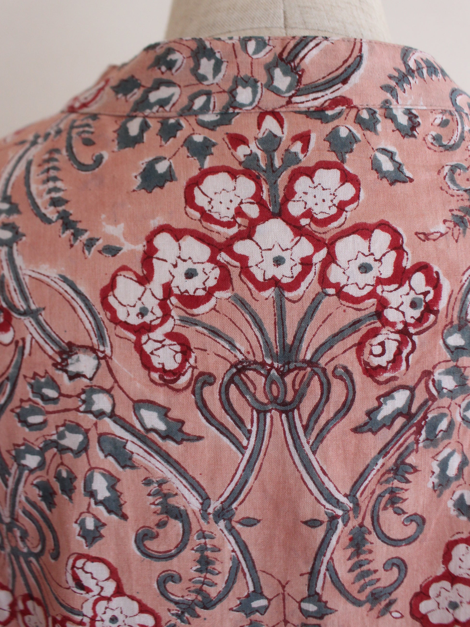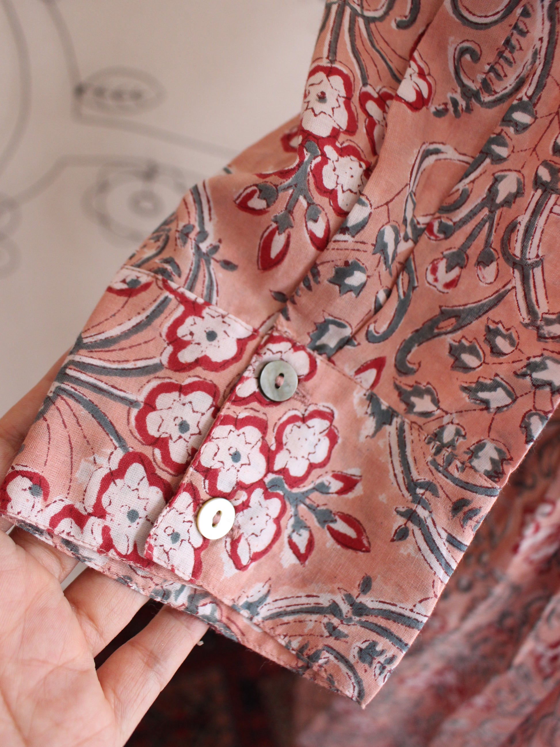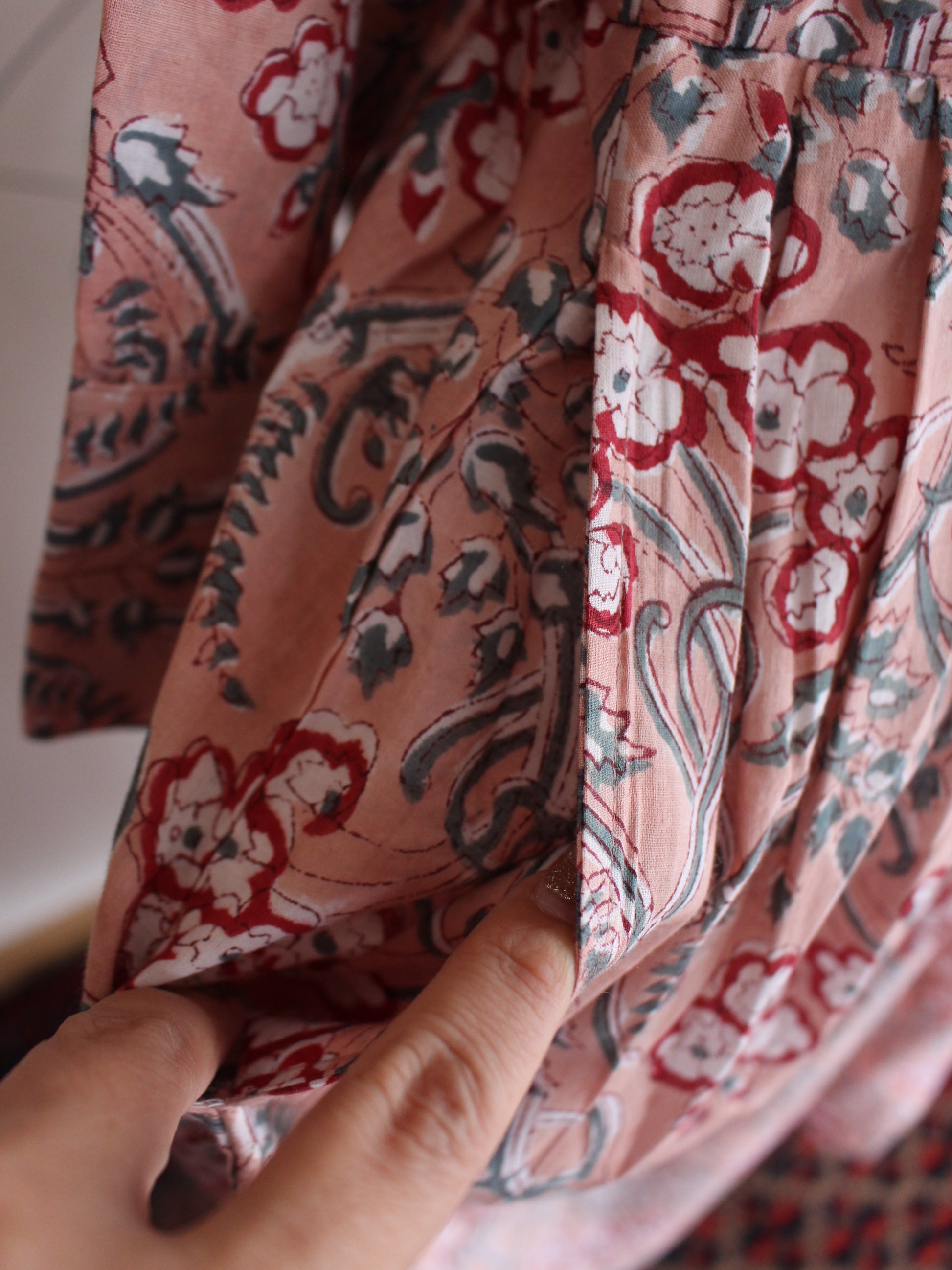 ブロックプリントは洗濯を重ねたり日を浴びると色落ちや退色します!ただ、古着好きの人に、良い色とくたびれ感ですねぇ‼っと先日とても褒めていただけました。自然染料なので日を浴びると退色しますが、この感じがお好きな方がいるんだぁっと、退色した色味を手放せずに着ていても、褒められることがございました。着すぎてクタクタなのでそろそろ手放そうと思った1枚ですが、まだいけるか?笑 生きた色と呼ばれる自然染料をお楽しみいただけたら幸いです。