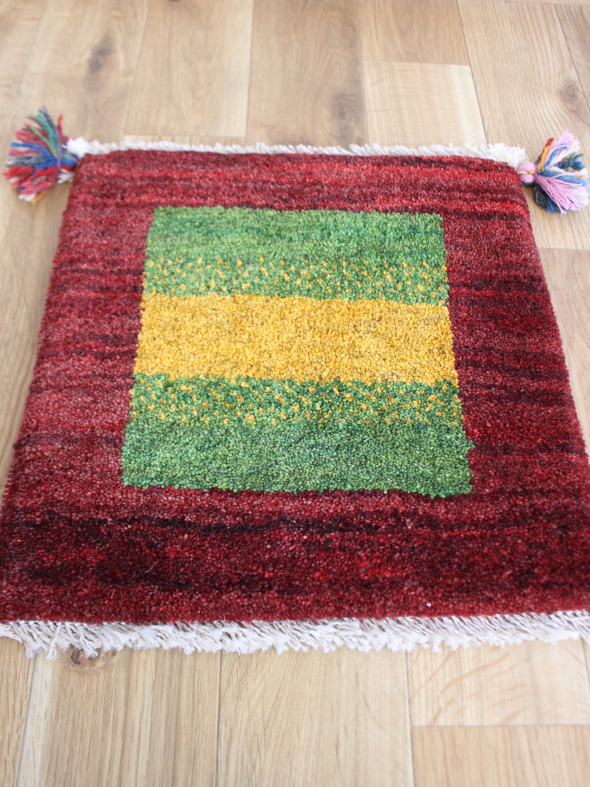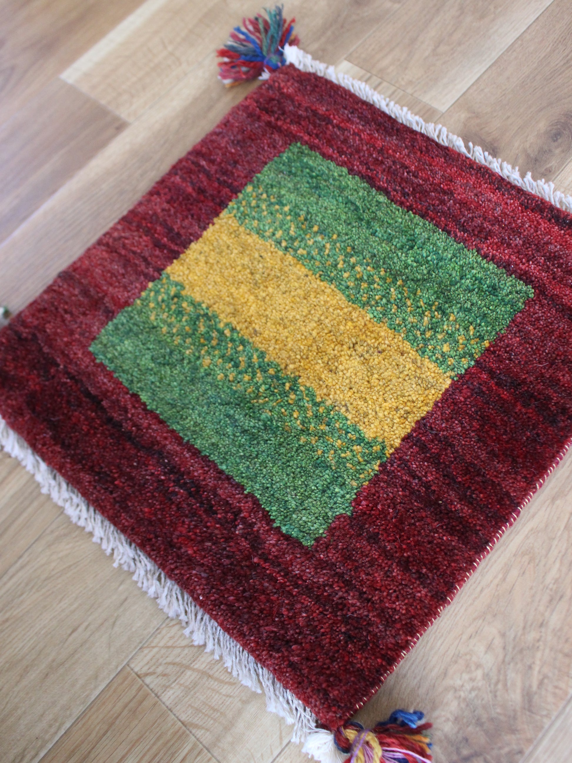 ムックラグ。ムック好きのためのラグ、笑。というのは置いといて、シンプルなギャッベ。動物や花、木など一切入れずに色味とグラデーションのみで勝負してるすっきりしたギャッベ。真ん中の黄色と緑のチラチラ具合も見事なのですが、私は周りを囲う赤のグラデーションが本当に美しいと思います。エンジの色味と時々深い黒のような赤が織り成す色味が店主てきにはぐっときます。ムック好きの方もそうでない方も、シンプルなギャッベっぽくない絨毯をお探しの方に♪