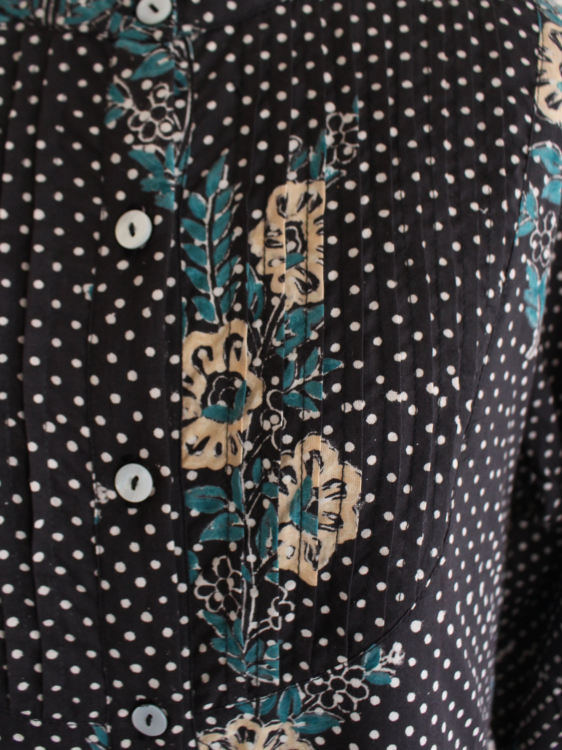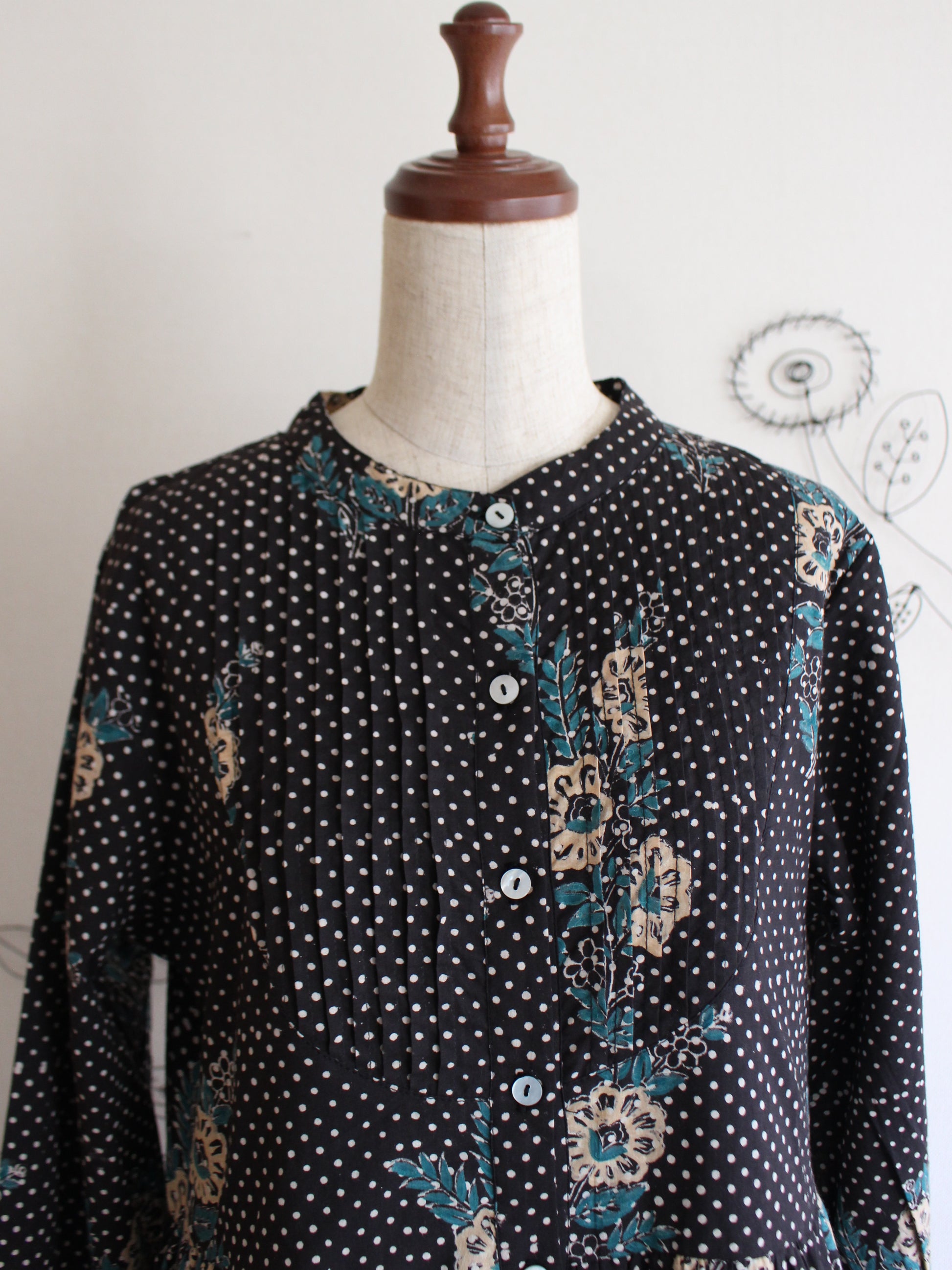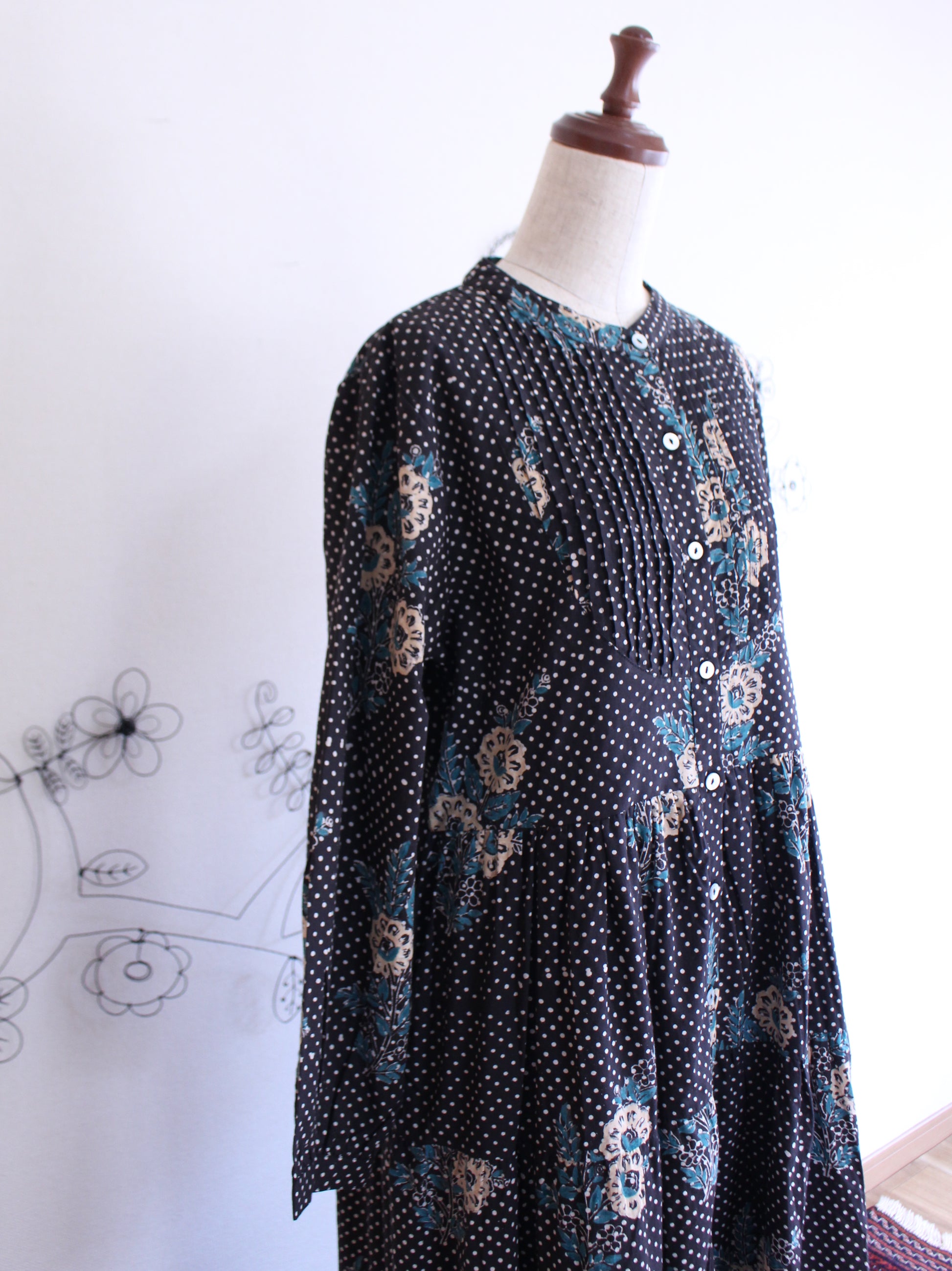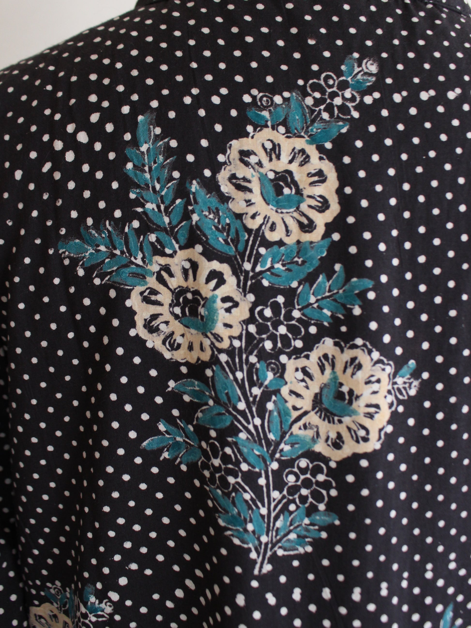 可憐で凛とする淑女ドレス!!!ドットが細やかで甘すぎないドレスに♪インスタグラムライブでもお話しましたが、ブロックプリントではあまり見ないドット♪ドットもあまり大きすぎると甘すぎる(子供っぽすぎる!)っと言われて、確かに!っと。細やかな柄だったのと珍しかったので即決オーダー♪花の色がサンプル生地だともう少し派手に見えましたが、手元にくるととても落ち着いた色味。オレンジ?薄茶色?肌色?何とも言えないのですが、この花の色味がますます大人のレディ感を引き立てます♪あーーー好き、欲しい。。。このドットが珍しいので、店主も欲しい。正直、この柄は、どこでも着て行ける万能なワンピース。真っ赤なカーディガンも合いそう!販売してる赤のカシュクールドレスともめちゃくちゃ合いそう。。。ほっ、ほっ、欲しい!!!!!(心からの叫び、涙)